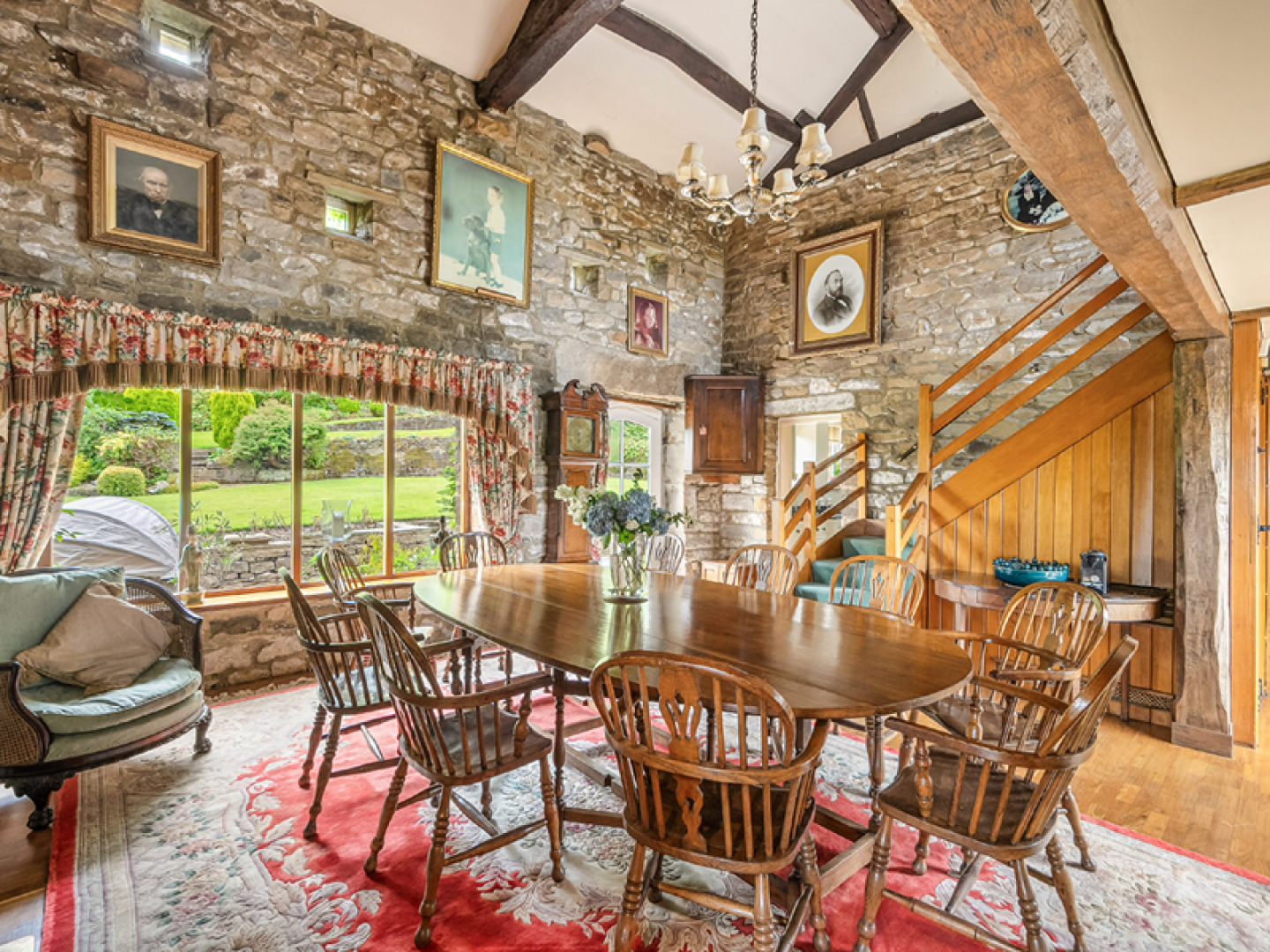 The accommodation flows from an entrance hall with cloakroom into a triple-aspect sitting room flooded with natural light, with breath-taking views at every angle. The double-height dining room exudes rustic charm and has characterful features such as wooden flooring, exposed stone walls, original beams, a fireplace with wood burner, as well as a galleried landing with a door that leads out to the principal bedroom.