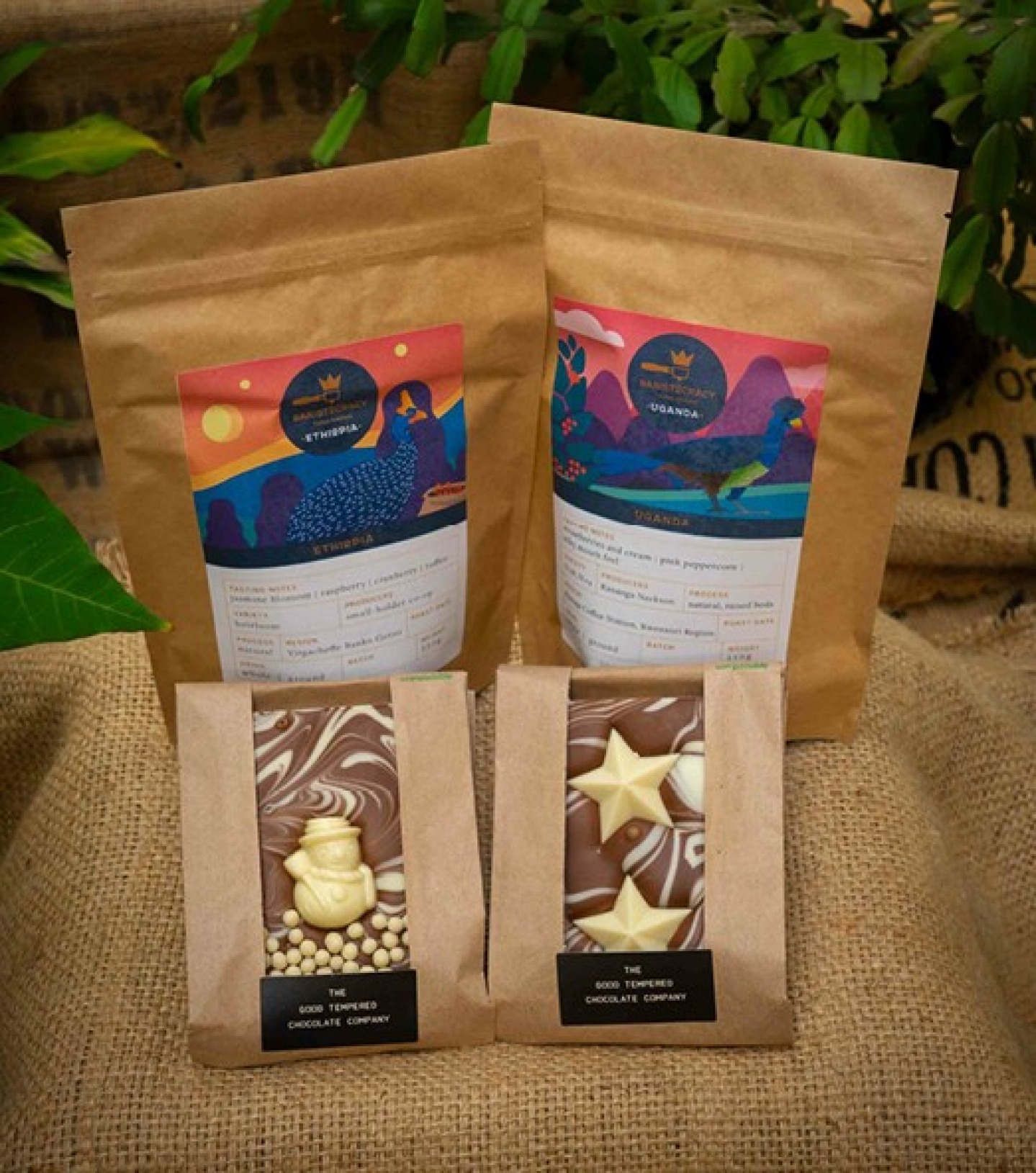 Choose two 250g bags of Baristocracy Coffee and two delicious Good Tempered Chocolate Company slabs to create a Christmas bundle of goodies, perfect for foodies. We love the Columbia coffee with tasting notes of pistachio nougat, caramel and chocolate, and the Star Slab (with white chocolate stars set into swirls of creamy milk and white chocolate) is a great choice for a Christmas gift.