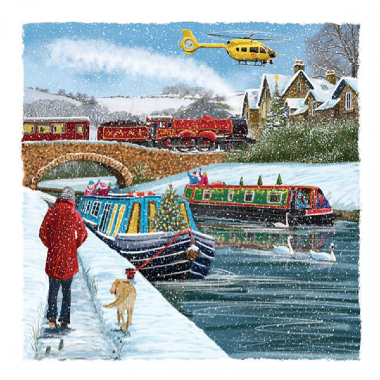 The new Christmas on the Canals Christmas card, features an illustration of one of Yorkshire Air Ambulance’s instantly recognisable helicopters and proceeds support their vital work across the county.