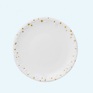 This L’Objet Haas Mojave dinner plate is ringed with intricate patterns, and speckled with gold. maisonmargauxltd.com