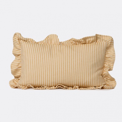 Its deep frill and elongated shape make this mustard-striped cushion ideal for a bed.