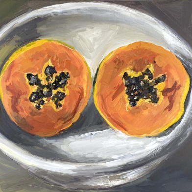 Papaya In a Bowl original painting, £195 Louise Bradley at Lime Street Studios, Ouseburn