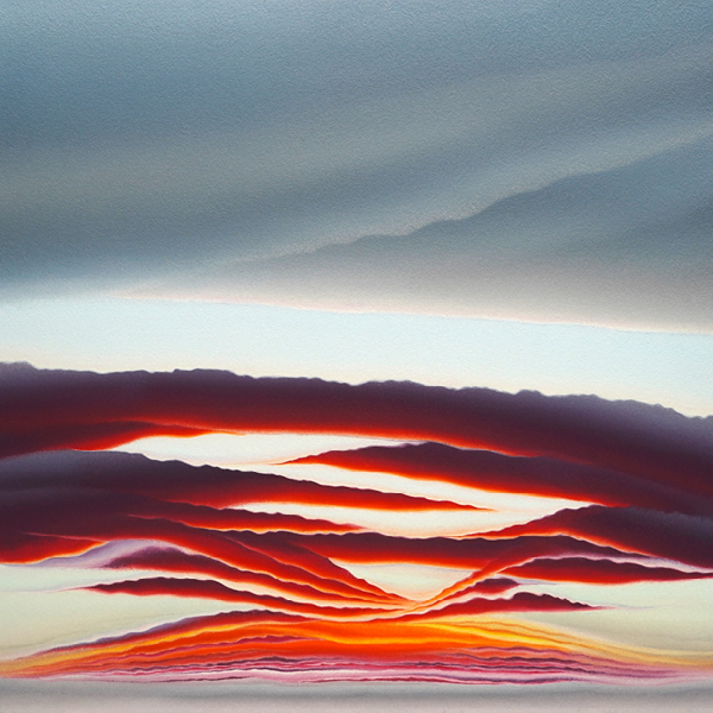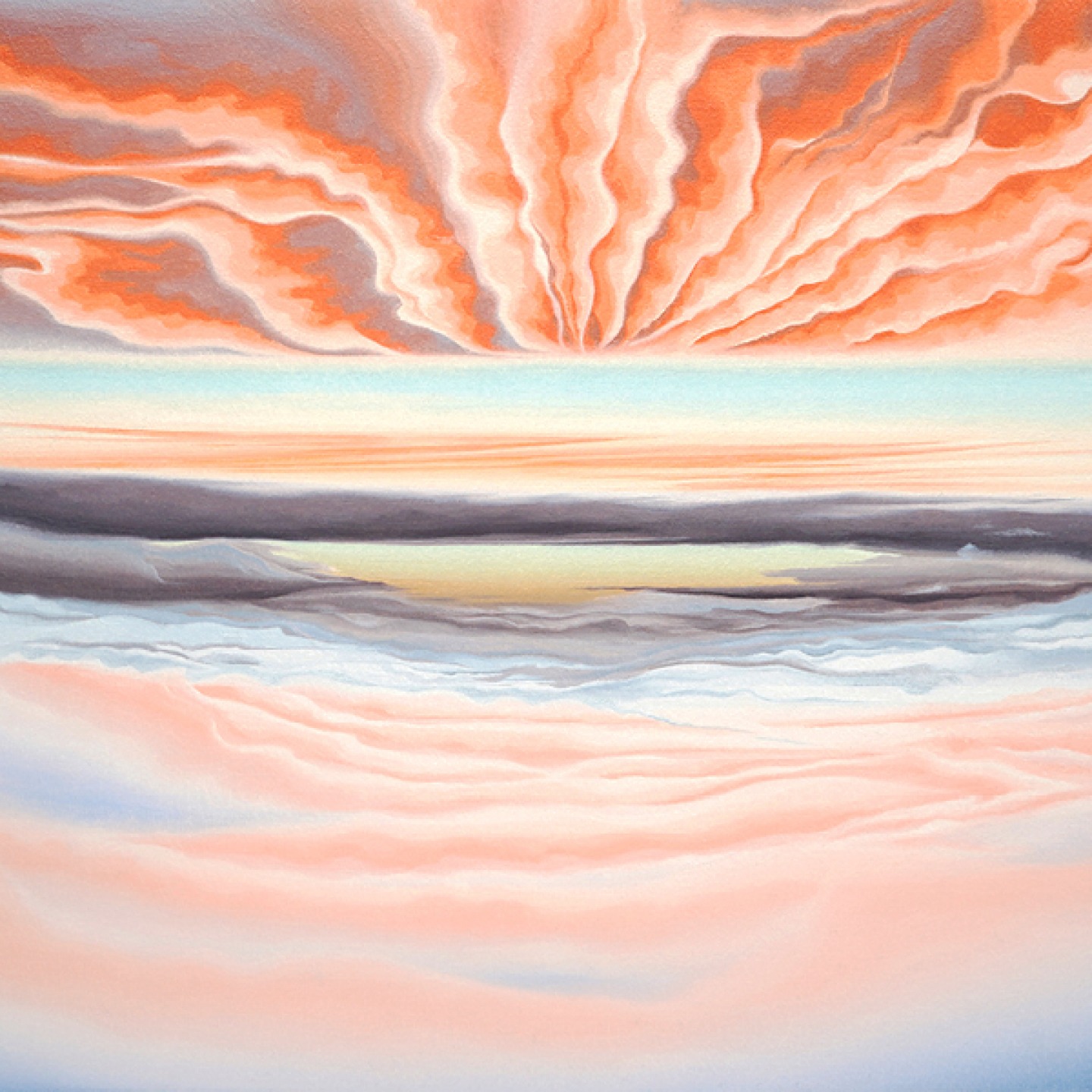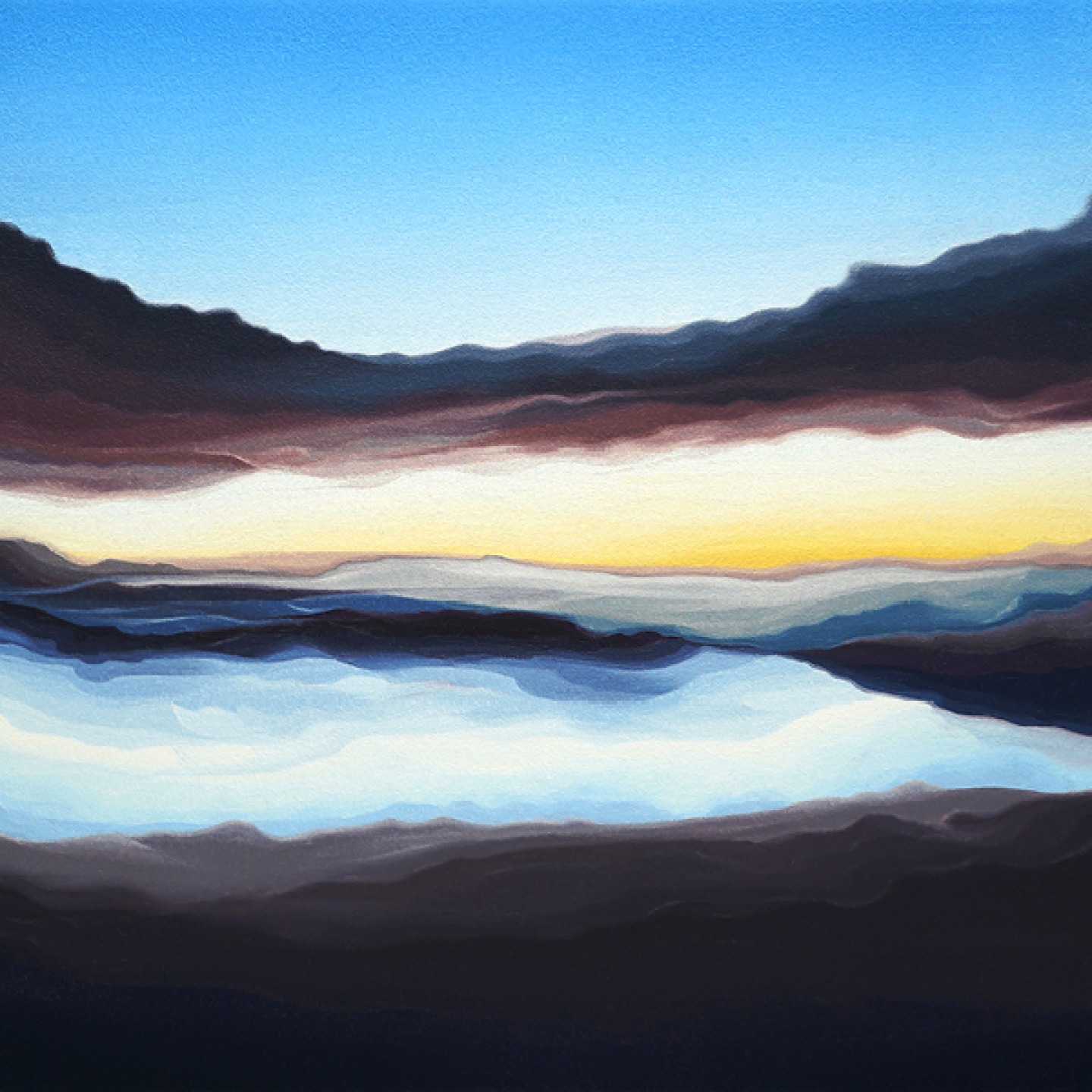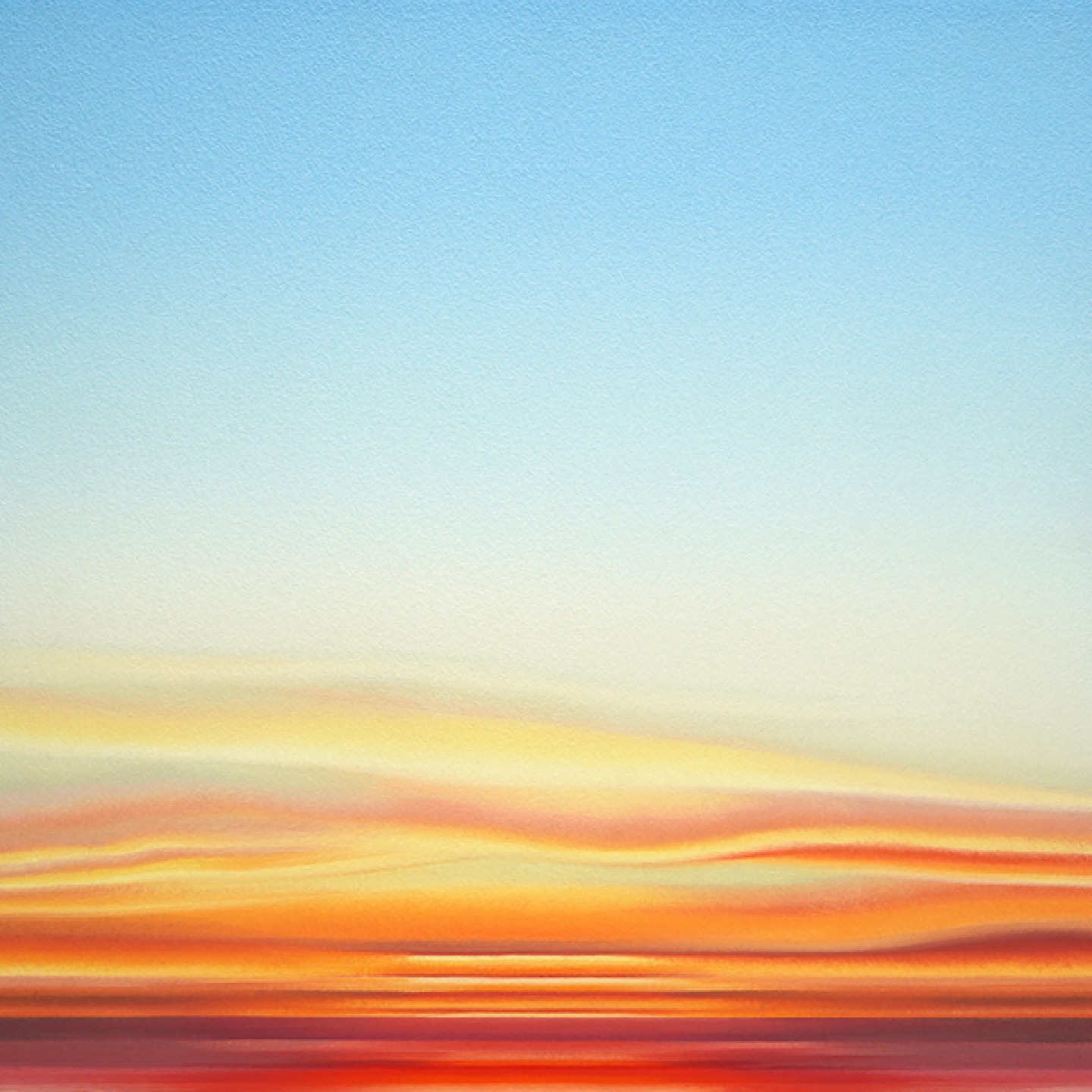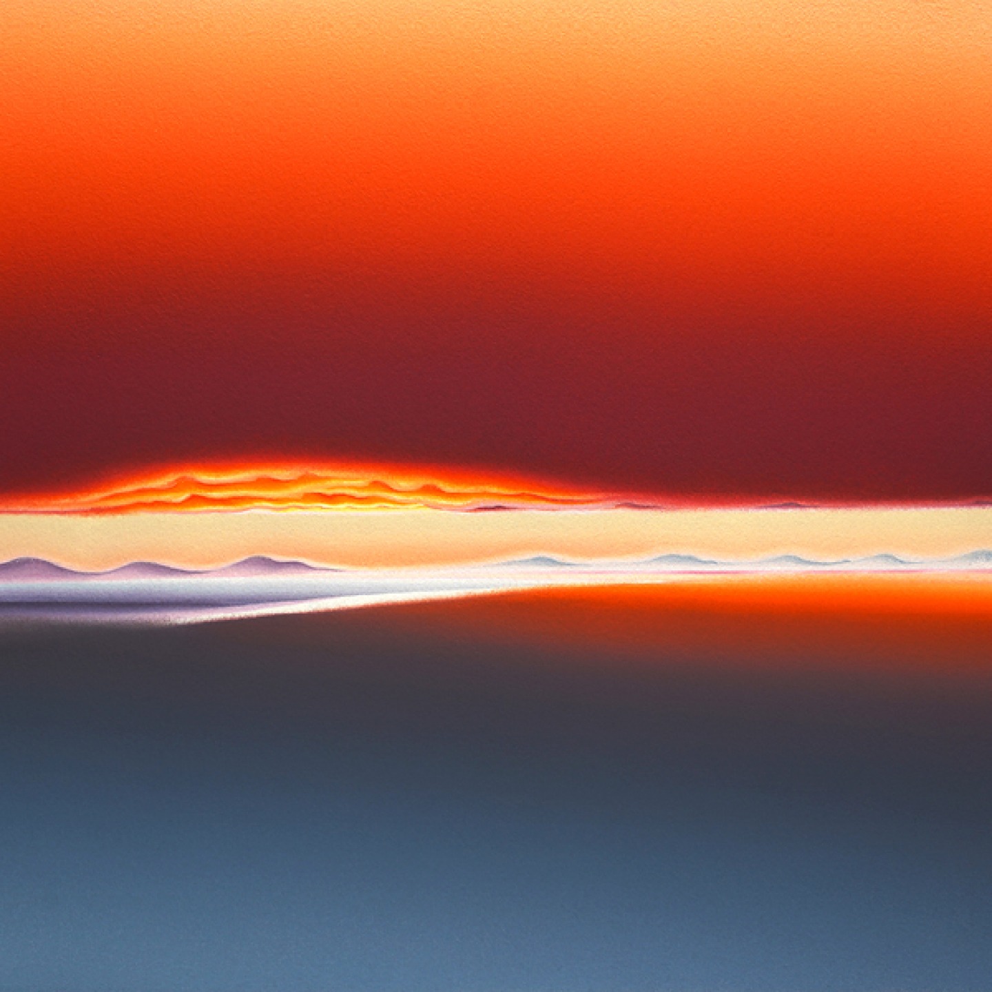 ‘The process involved taking the colours from the sunrise which I’d documented in note form then following a systematic approach, I worked my way through the colours methodically from top to bottom on how the sunrise worked. Over time that process became more intuitive which allowed more spontaneity in guiding where the painting might go. My aim wasn’t to reproduce any of the sunrises, I just wanted to capture the essence of them. That essence is spontaneous, random, unique and only happens once. When I allowed that ethos of how to paint to guide me, it opened up infinite possibilities.’