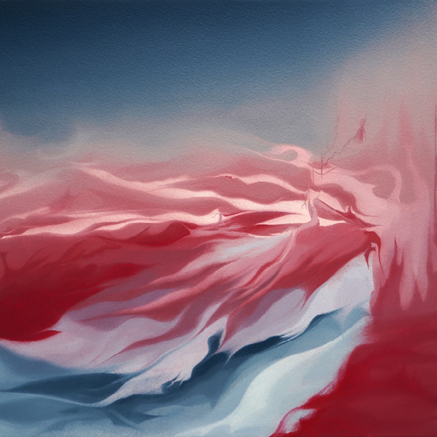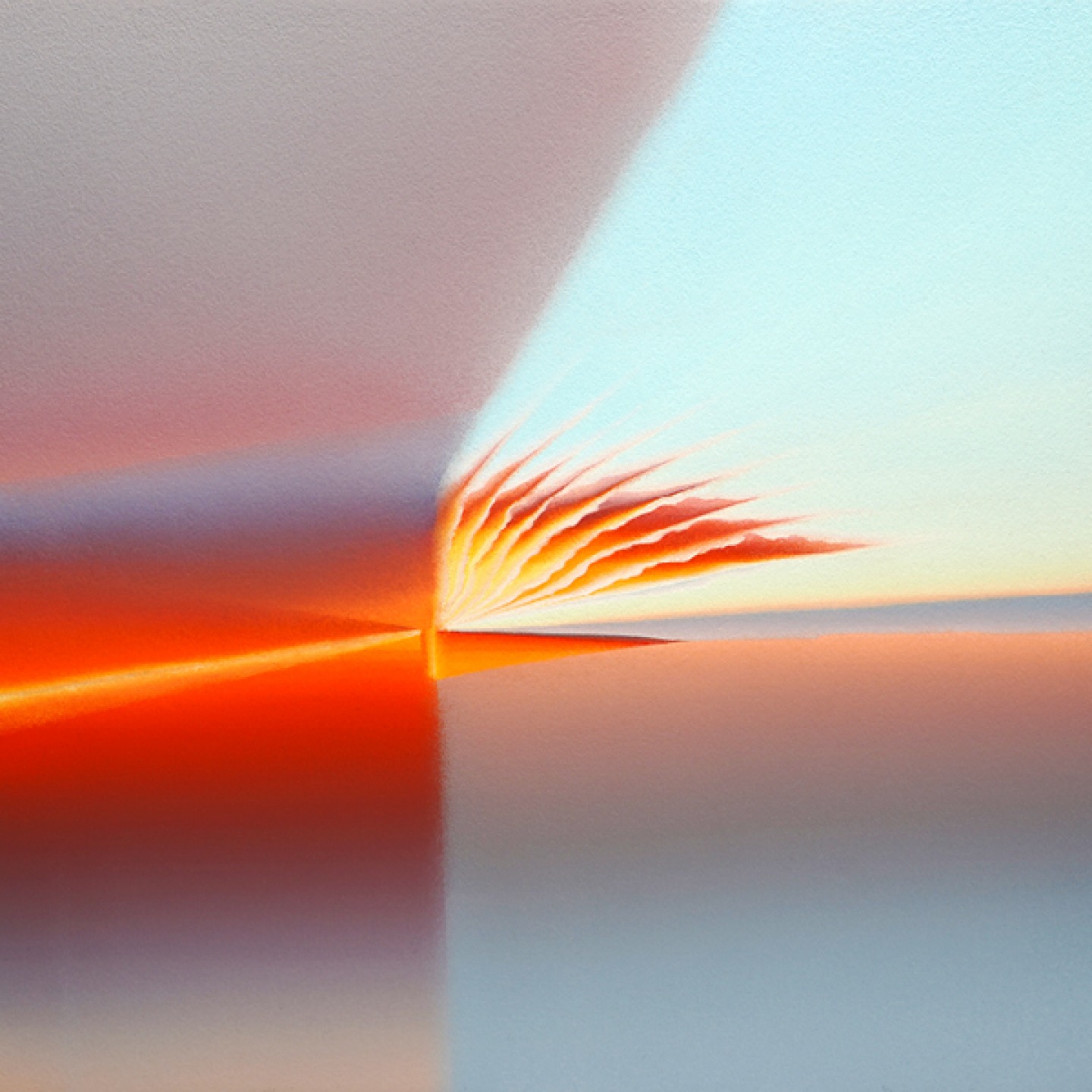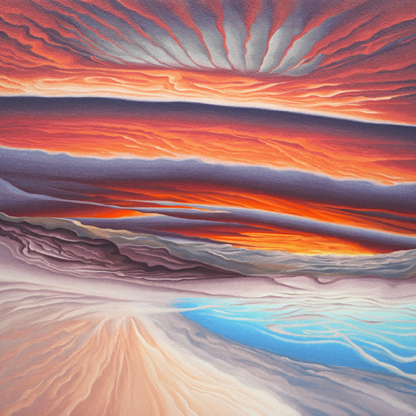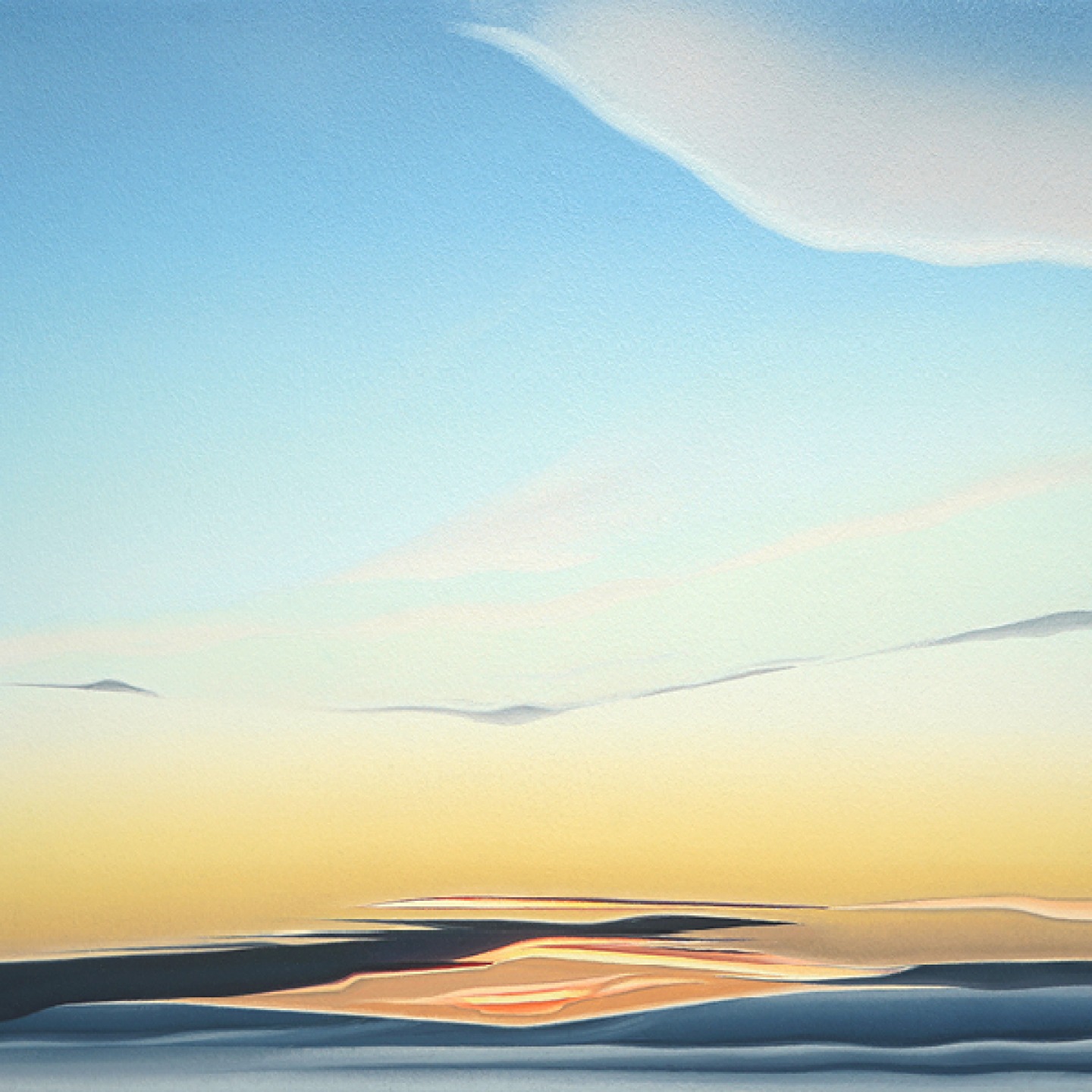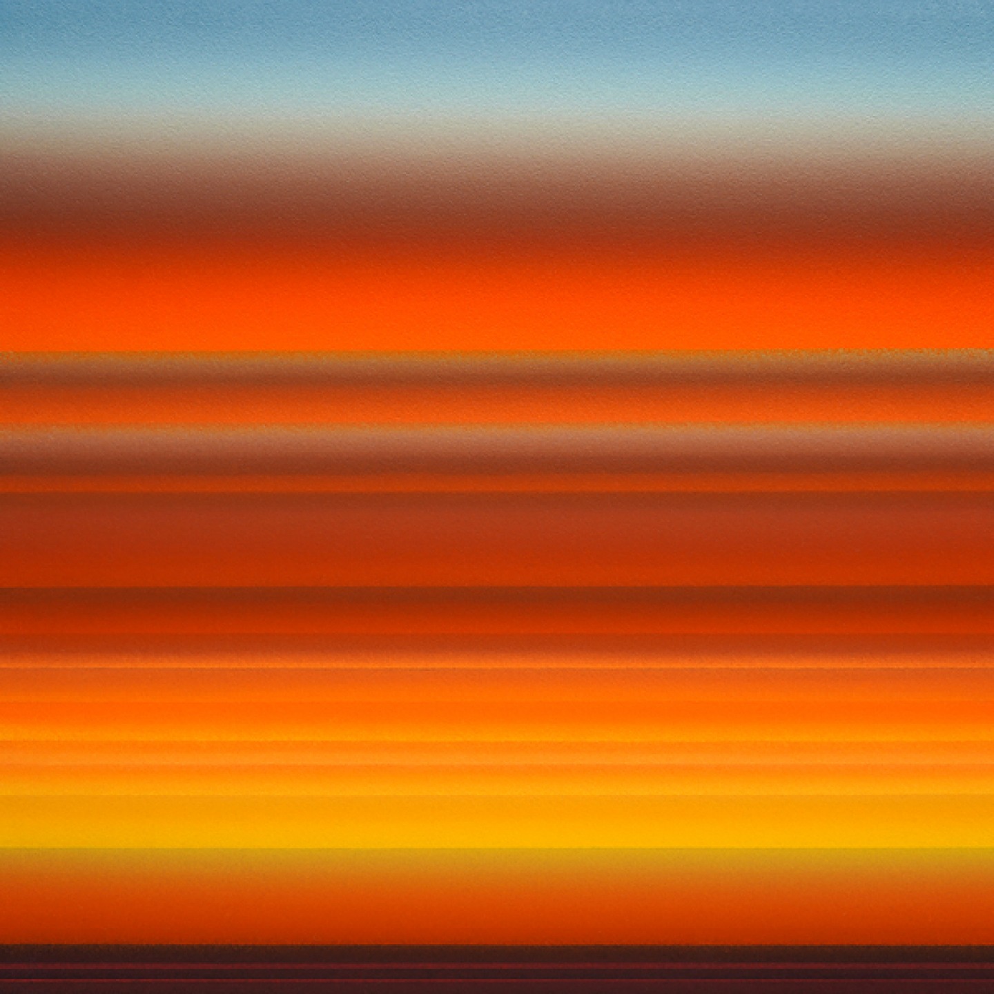 ‘The process involved taking the colours from the sunrise which I’d documented in note form then following a systematic approach, I worked my way through the colours methodically from top to bottom on how the sunrise worked. Over time that process became more intuitive which allowed more spontaneity in guiding where the painting might go. My aim wasn’t to reproduce any of the sunrises, I just wanted to capture the essence of them. That essence is spontaneous, random, unique and only happens once. When I allowed that ethos of how to paint to guide me, it opened up infinite possibilities.’