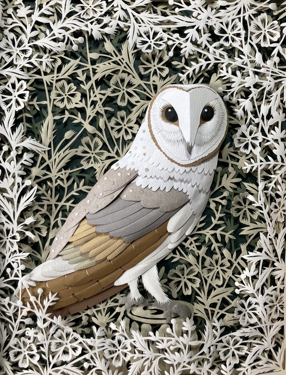I have loads of different coloured tonal papers and each layer is individually cut. It’s all done with scalpel work after I’ve initially sketched the design on the back. I pick the subject (normally it’ll be a bird or an animal) and once I’ve found my image, I’ll create a nest to house it in by overlapping the paper. I cut all the layers and I’ve got tools that I use to emboss, then I’ll individually cut the components to create depth in each piece.