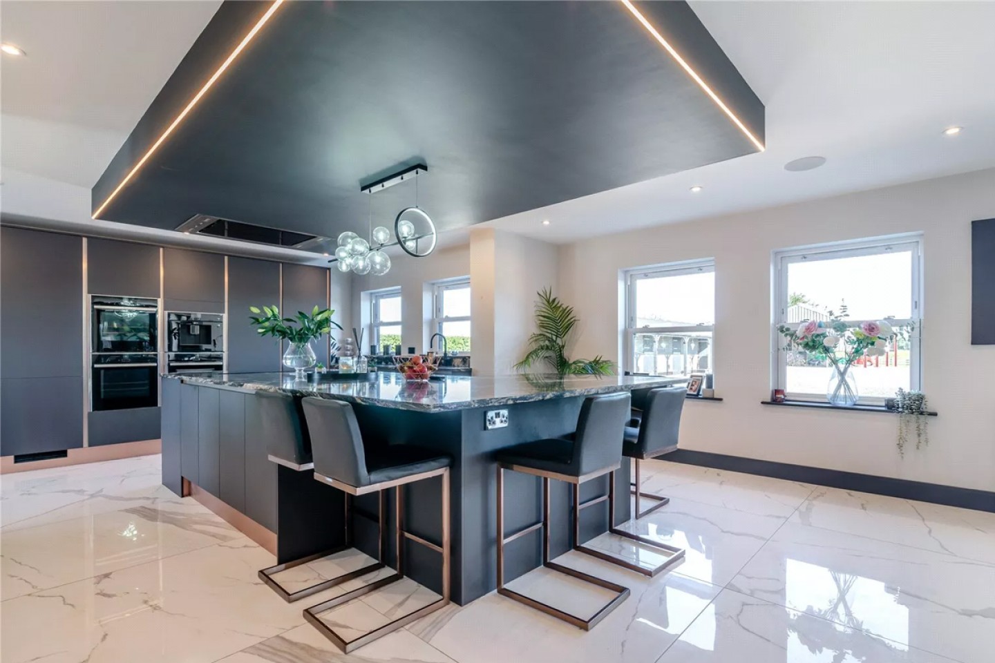 On the first floor, the principal bedroom includes a fitted dressing room and ensuite shower room with twin sinks and a double shower. There are three further bedrooms, one with an ensuite shower room. There is also a spacious family bathroom with a bespoke freestanding bath.