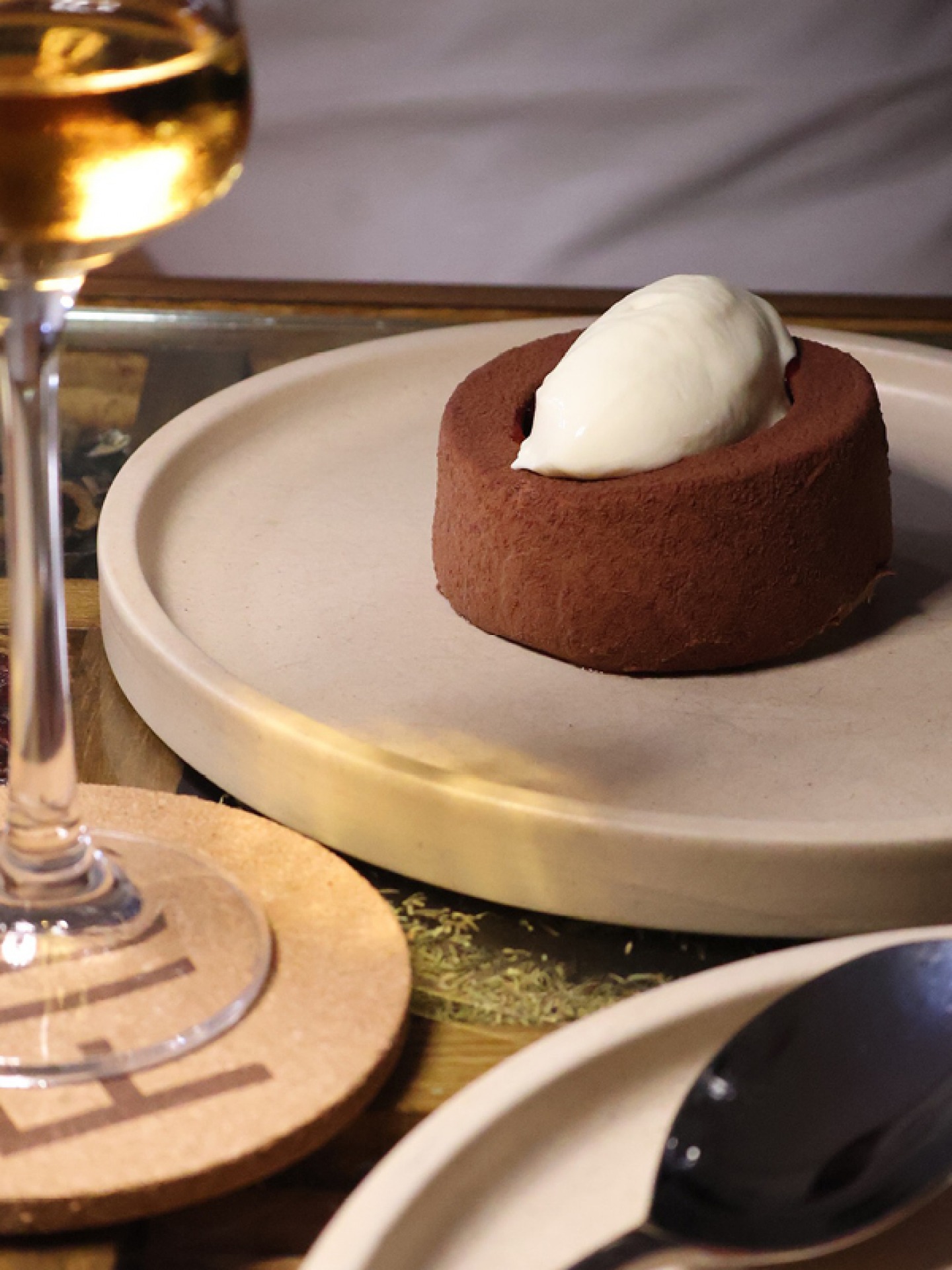 ‘My Heart Bleats for You’ is up next, and the wonderfully tender lamb loin is served with aubergine, courgette and tomato – a change in direction from the fish-heavy first half of the menu (not that you’ll find us complaining). After this, the penultimate course is a choice between a selection of cheese or chocolate-dipped strawberries. Thankfully, my dinner companion and I have a matching sweet tooth, and the strawberries are fabulously juicy.