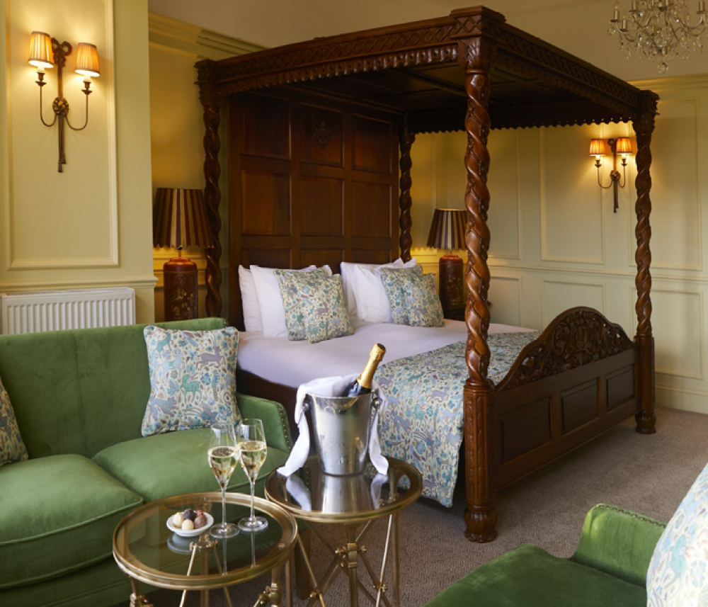 On returning to Wrea Head Hall, we head straight upstairs to change for dinner. Our room is spacious and well-furnished with heavy wood pieces, including a beautiful bureau and a full length free-standing mirror. There’s a seating area with two sofas by the large windows, and a fabulous four-poster bed. The bathroom is more modern, but no less opulent.