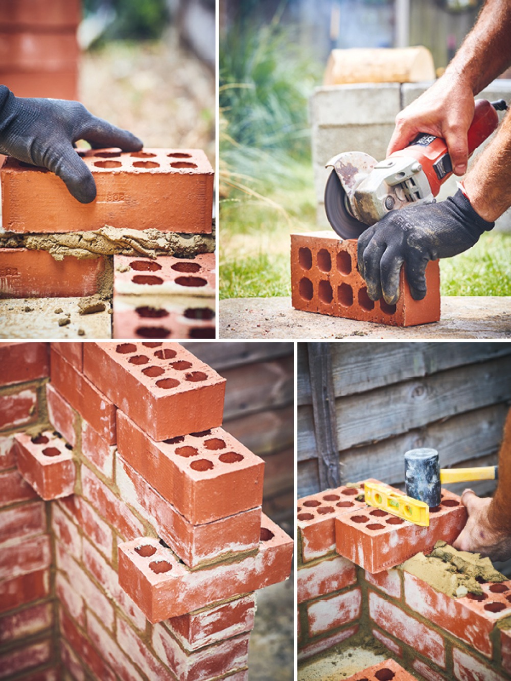 Lay five further courses in alternating patterns. Pattern A, pattern B, pattern A. You should end up with seven courses (layers) of bricks, making a structure about 375mm high. The eighth course of bricks will create the ledge that will hold the paving slab in place, so the arrangement is different again: pattern C.