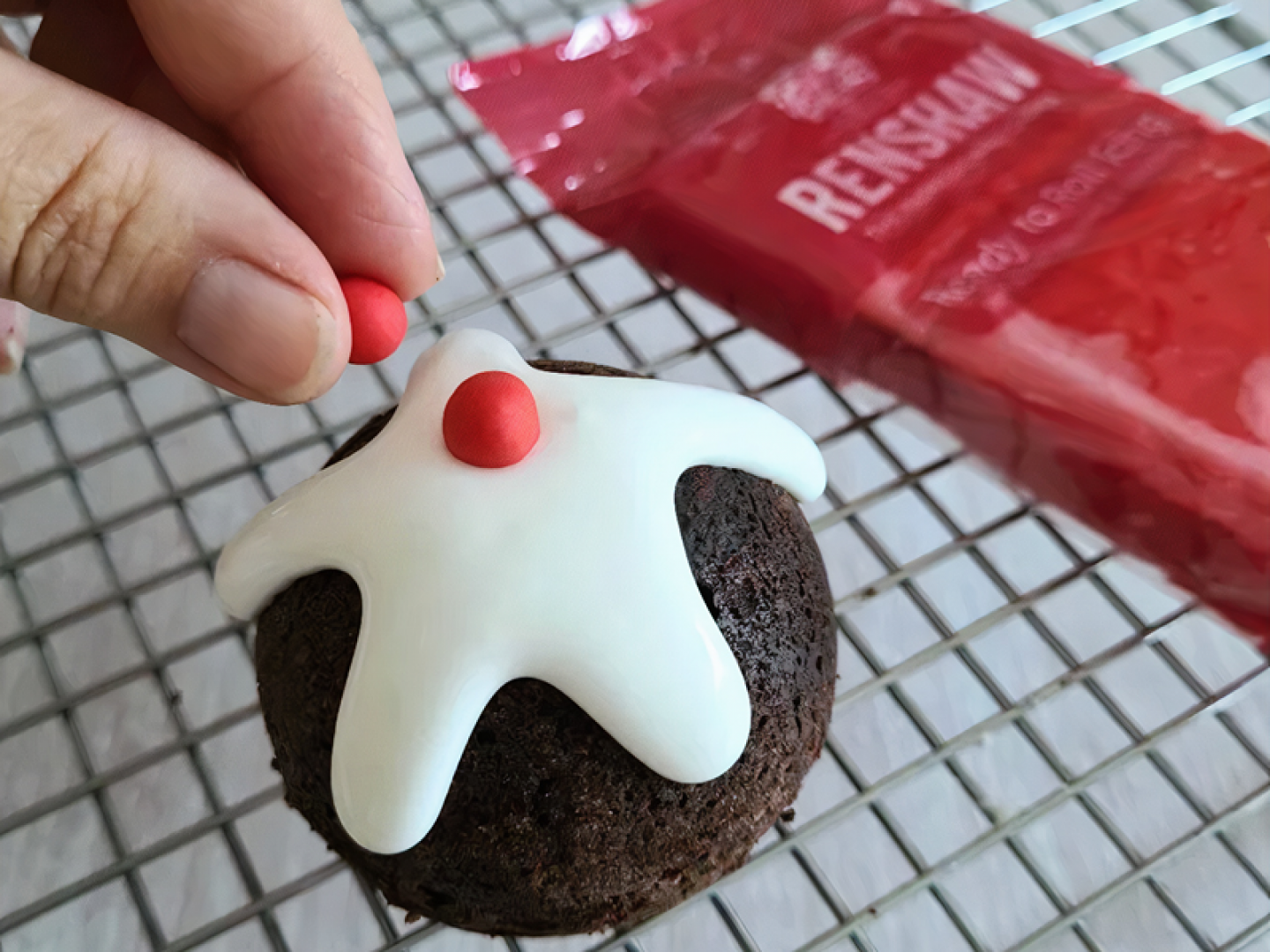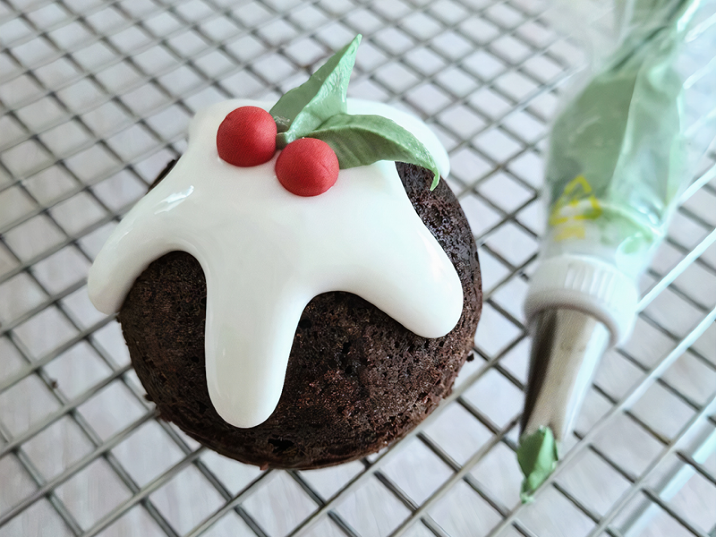 Roll some holly berries out of red icing and position on the tops of the cakes.