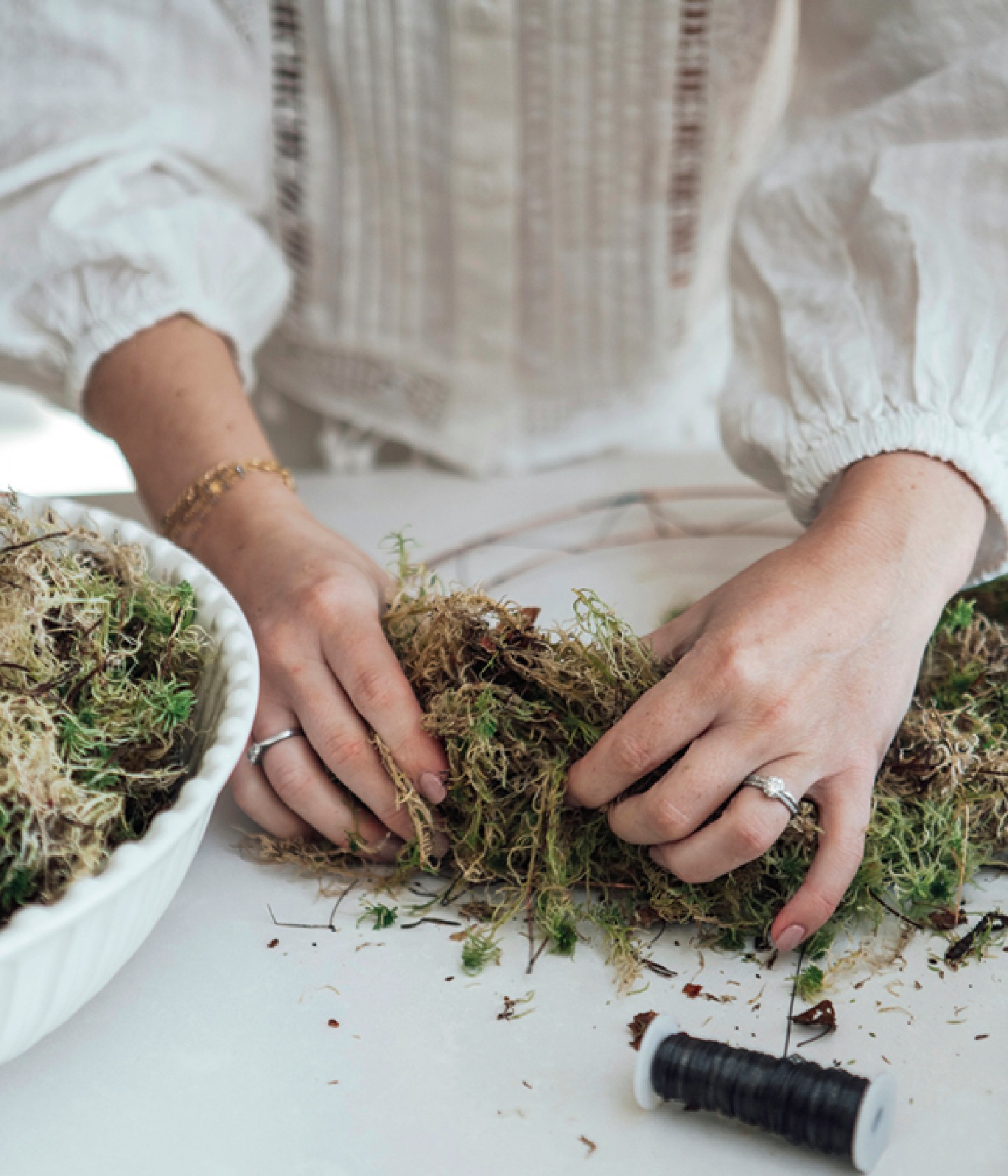 2 Add a chunky layer of sphagnum moss to the wreath base and secure it by taking the wire over and under the frame the whole way around. Keep the wire attached to the wreath.