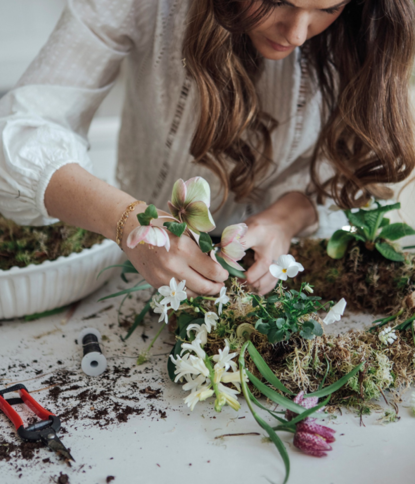 3 Separate the bulbs, shake off any compost and run the roots under a tepid tap to remove any remaining compost. Lay the bulbs onto the wreath in a formation you’re happy with. Keep in mind that the bulbs may grow taller, so consider the height they will grow to when positioning them.