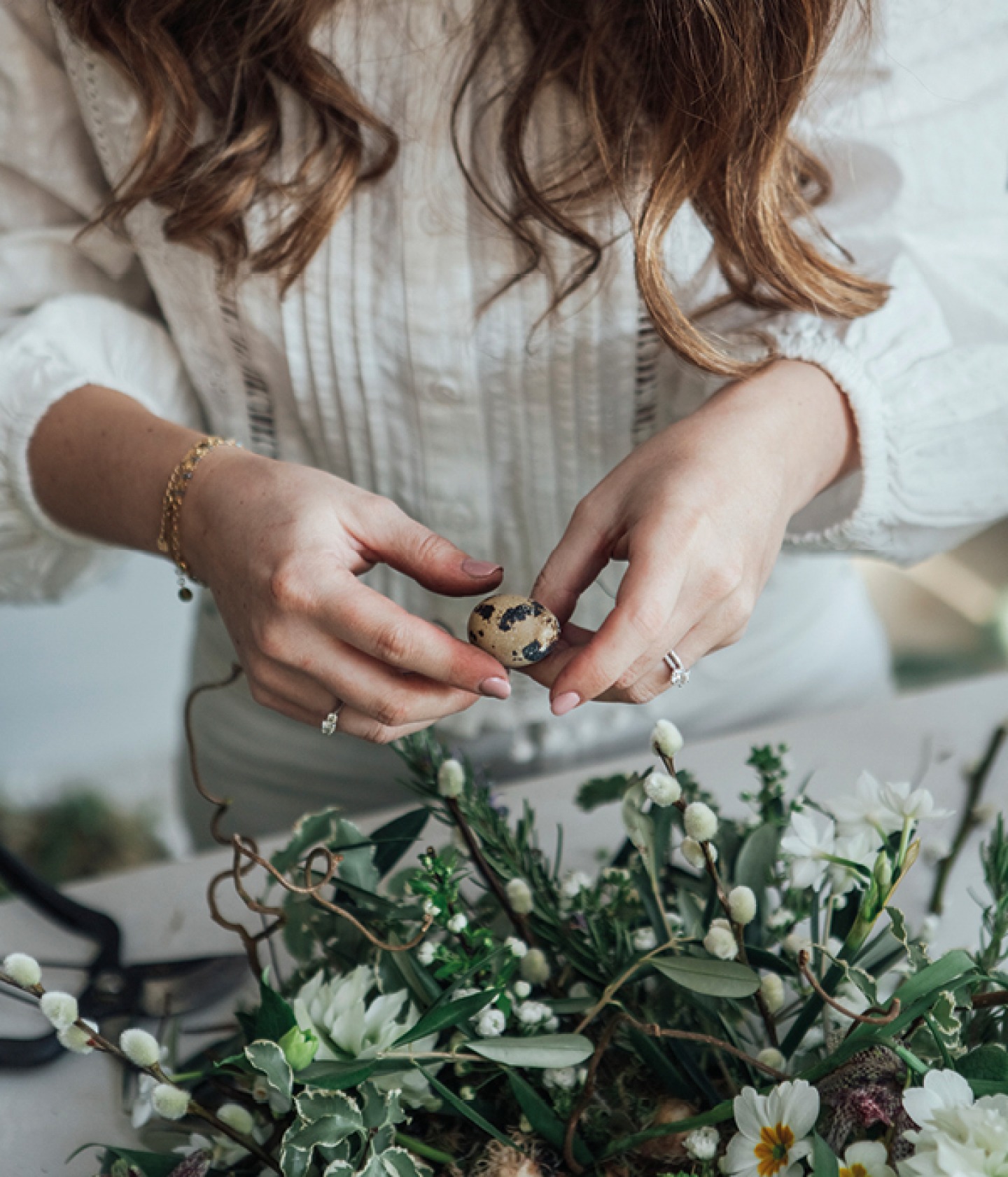10 To attach the quail’s eggs you can either use a glue gun, or wire them like I have here. Simply poke the wire carefully through the egg, bring the lengths of wire down, twist them around each other as close to the egg as possible and then insert the lengths of wire into the wreath base.