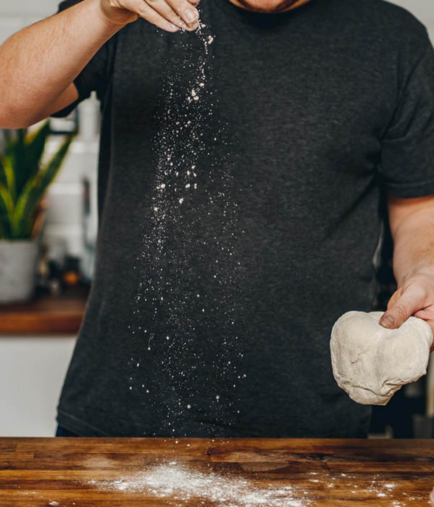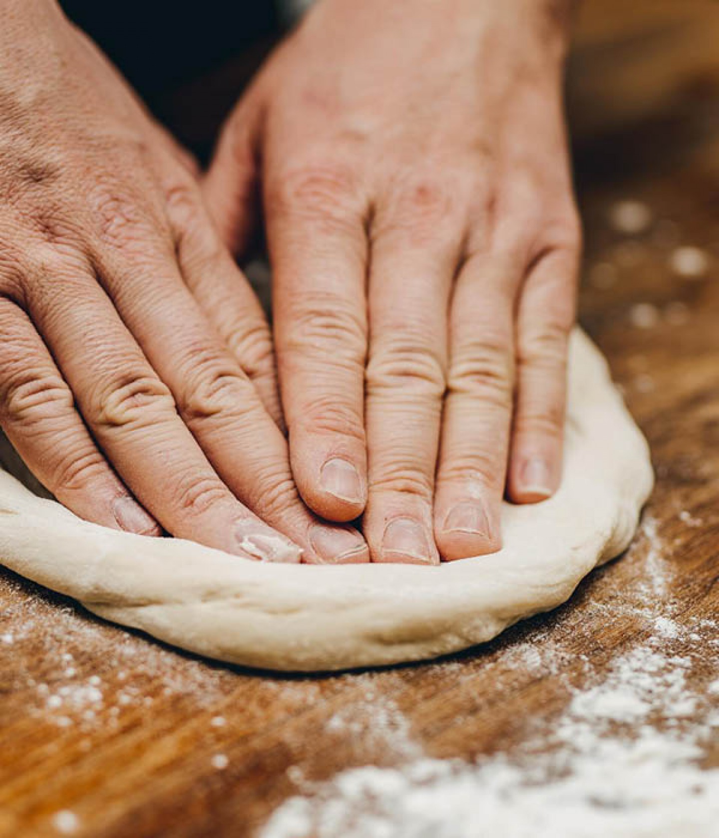 Place your dough ball on a lightly floured surface then generously dust with ‘00’ flour. The dough ball should be completely covered in flour, as you don’t want any sticky spots.