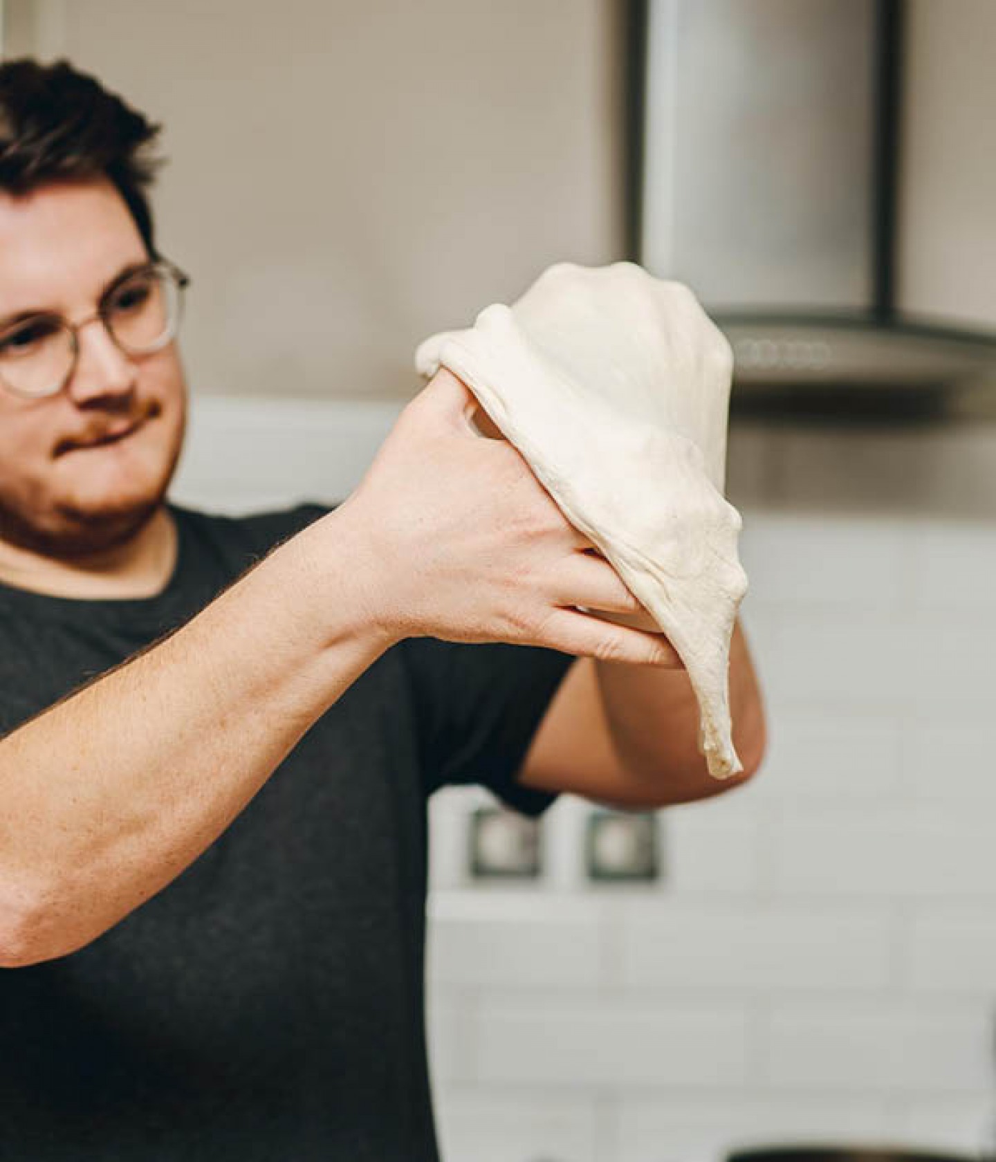 Transfer the pizza base to the back of your hands. The edge of the crust should rest on your knuckles, with the rest of the base hanging down. (It’s a good idea to ‘de-bling’ just before this stage, as jewellery will poke a hole in the delicate dough.)