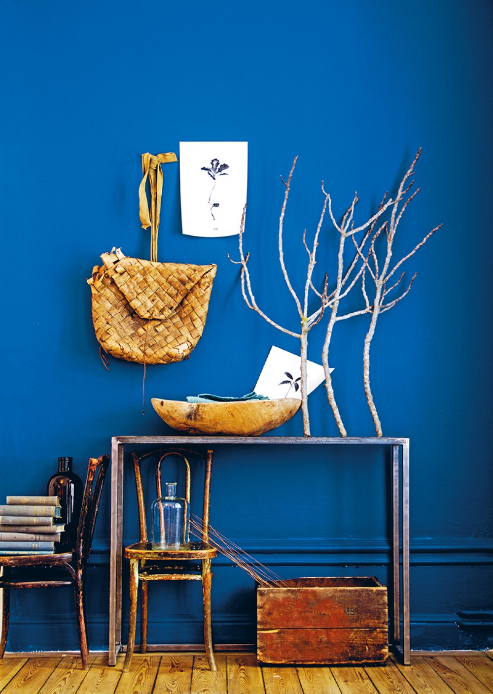Although my favourite flowers, grape hyacinths, appear in spring, together with wonderfully scented hyacinths, I always associate the colour blue with summer – for the hot, sunny days with blue sky overhead. Painting your walls a deep blue will give you a sense of summer all year round, and you can add warmth with natural objects and colours. The console table and botanical prints were designed and produced by Drythings, and the furniture and accessories are flea-market finds.