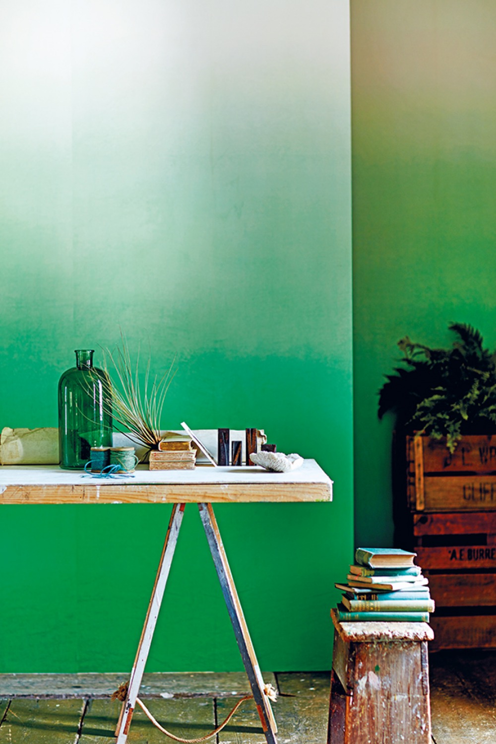 So many shades of bold green look amazing in interiors. I recommend using darker tones as the backdrop and the brighter shades as accents, as they can be quite invasive if used on a large scale. Green colours are easy to mix – just look to nature for inspiration. A shaded green-painted or papered wall will work beautifully as a backdrop for darker green tones and pale colours alike, such as this simple trestle desk in front of wallpaper by Designers Guild.