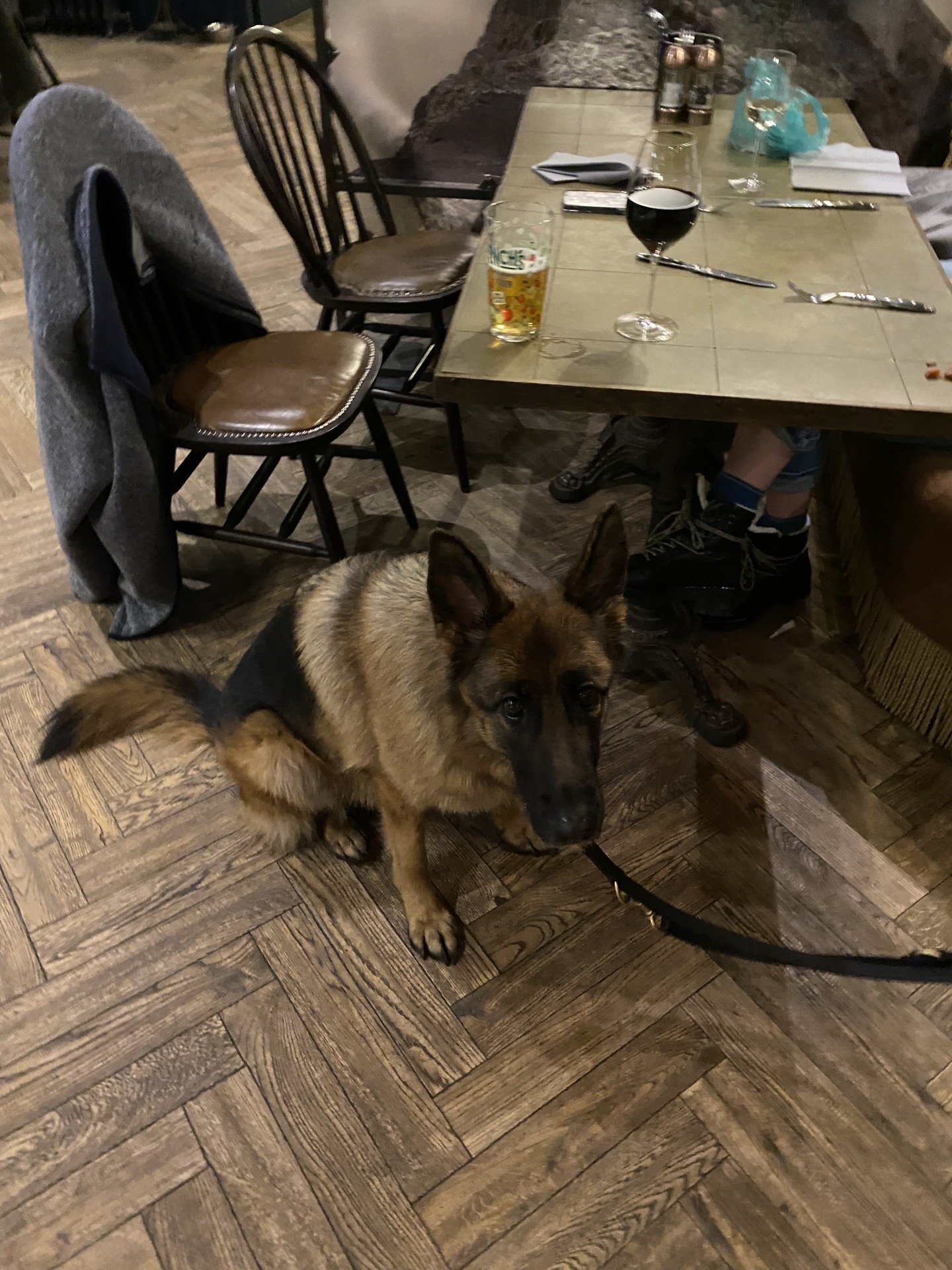 While we waited for our main courses my dad went round saying hello to people, this was hideously embarrassing for all of us but all the dogs he chatted to seemed genuinely interested in what he was saying, unlike most of the people. Some of the pups he met in no particular order of preference (though I really liked Ava) included a lovely Lab called Fred (who had never heard of Konni from Russia) but was one of the best travelled dogs I’d ever met, his mum and dad had been everywhere (their favourite restaurant was Winteringham Fields if you’re interested). We also met two white fluffy types called George and Louis (they were a bit loud at times), Ava was a splendid Alsatian and very glamorous.