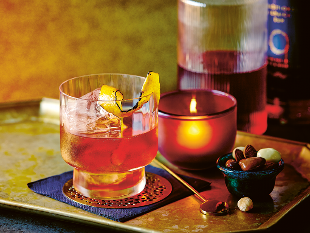 Add the ingredients to an ice-filled mixing glass and stir. Strain into an ice-filled rocks glass. Finish and garnish with a flamed orange twist and serve at once.
