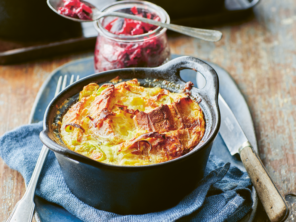 Remove from the oven and allow to sit for five minutes. Serve with the beetroot jam and a crisp green salad.
