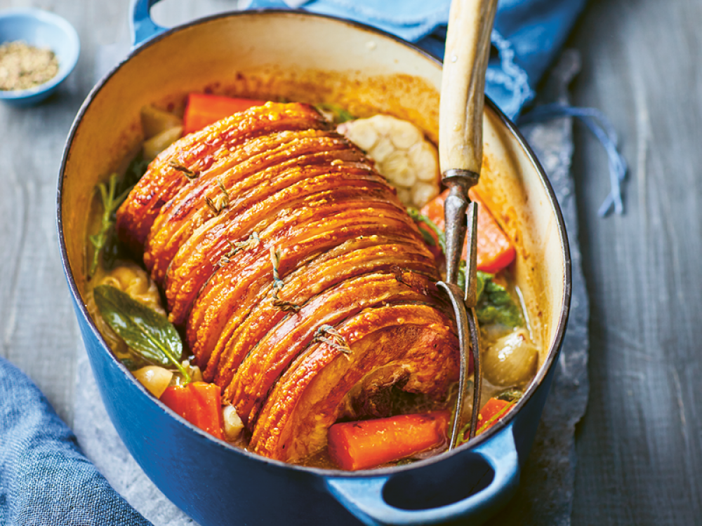 Increase the oven temperature to 210C fan/230C/Gas 8. Remove the pan from the oven. Carefully lift the pork out onto a warm plate and snip away the string. Place the skin on the prepared baking sheet and return it to the oven for 10 minutes or so until it is really crisp.