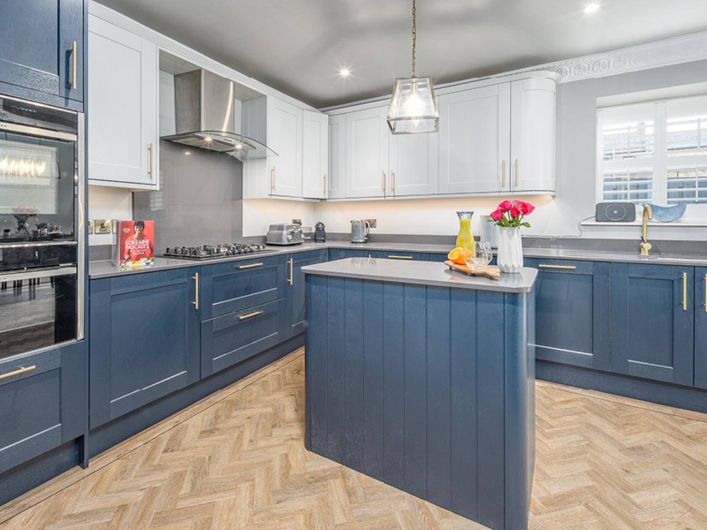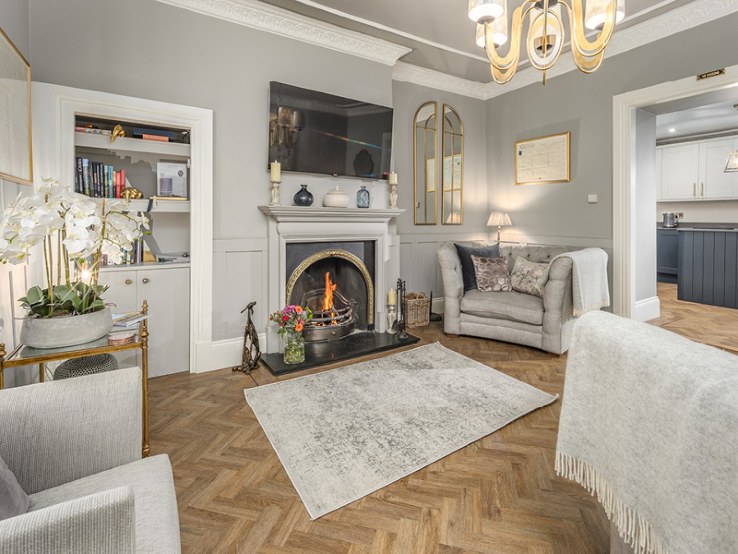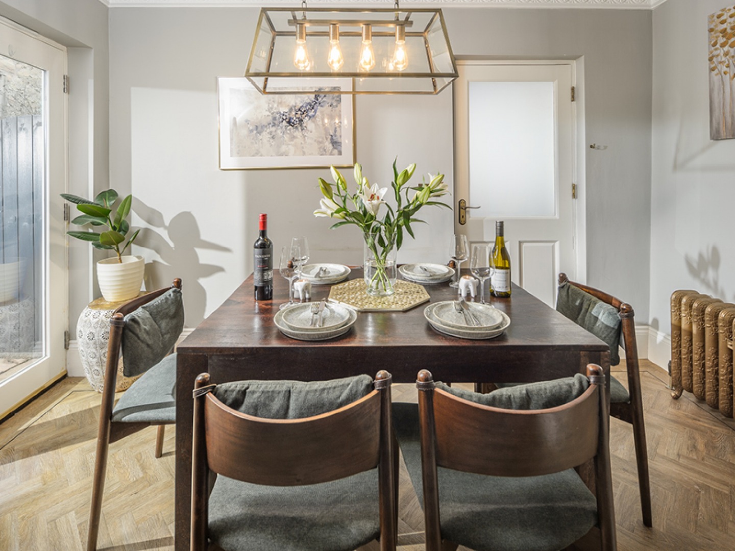 Inside the lounge with period features, you’ll find a large four-seater sofa, love seat and armchair providing ample seating, with a large Smart TV positioned above the fireplace. Off the lounge is an open-plan dining kitchen, finished with bespoke cabinets. The dining area with feature lighting looks out through glass French doors to the rear garden and has seating for up to six.