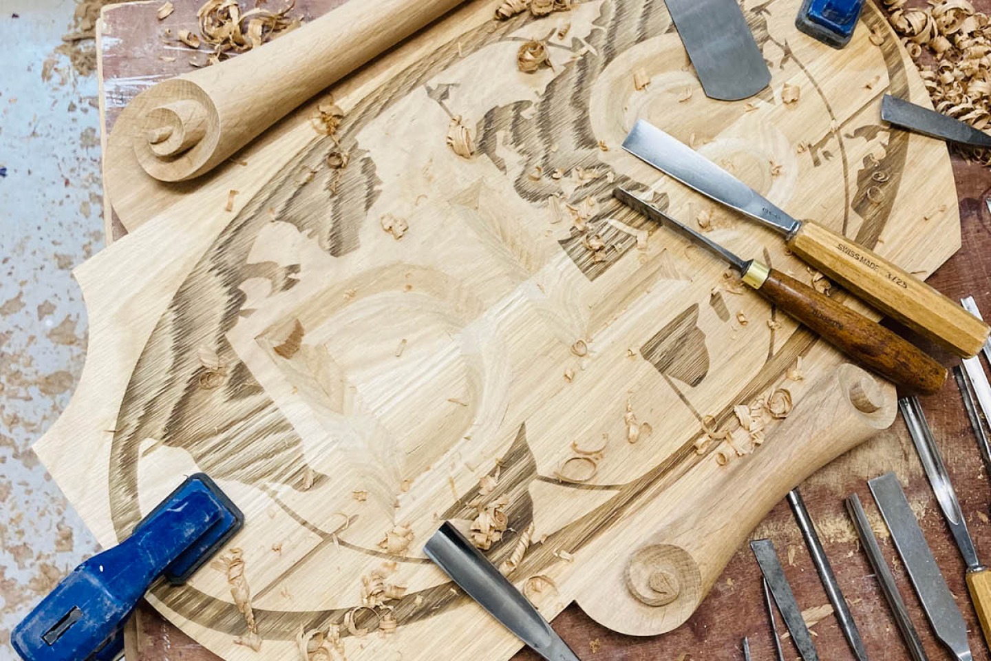 One of my latest creations is a mid-century-style side table, which I call the ‘Smiley Table’. It features two piston-fit drawers and a leather thong underlay shelf for the magazine. I recently showcased it at the Great Northern Events at Victoria Baths in Manchester, where it received lots of positive feedback. I’m also working on some custom logos and signs for companies. These are hand-carved in oak, often in a cartouche style similar to my own workshop sign. For me, wood carving is more than just work – it’s a form of meditation that helps relieve stress and manage anxiety.