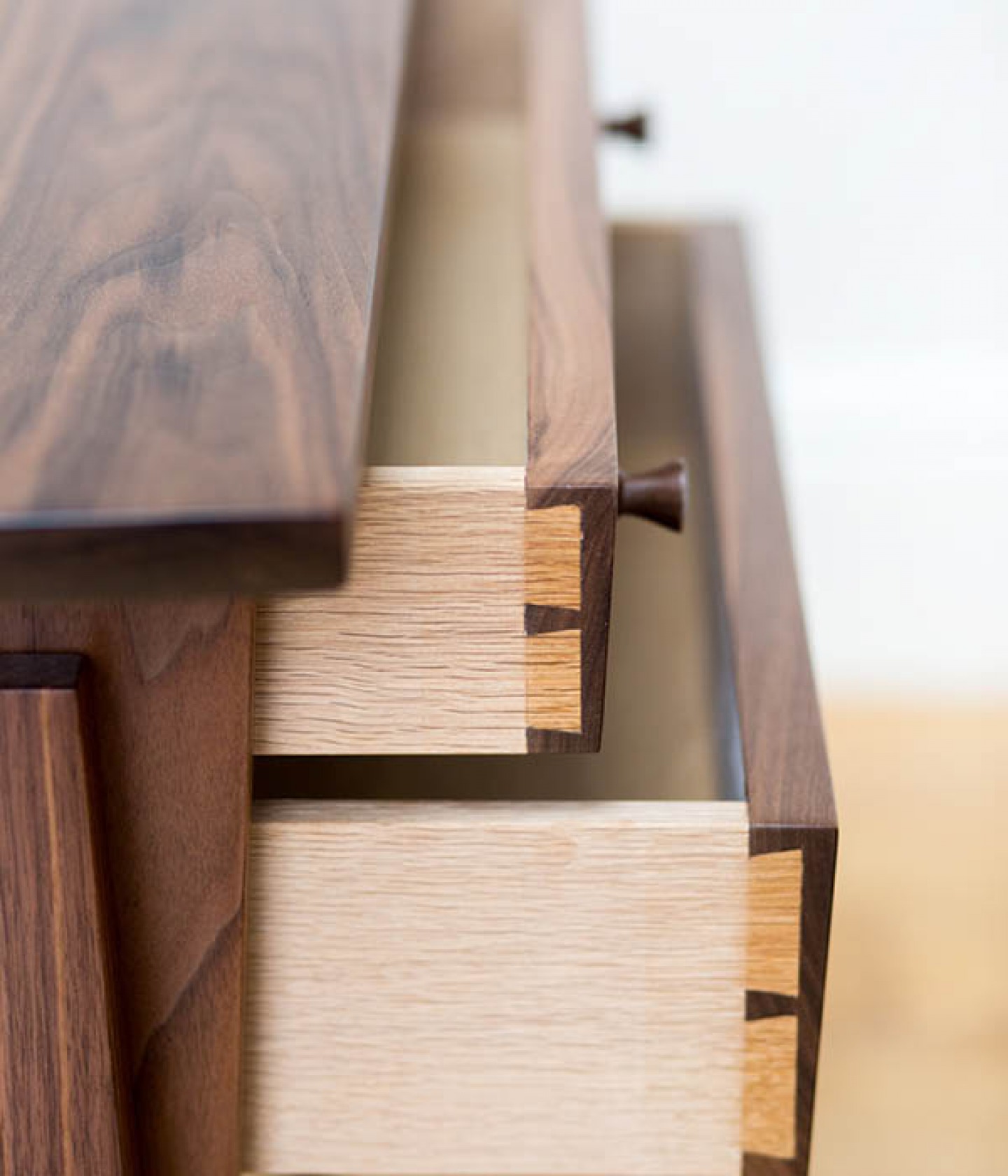 The short answer is that I don’t find things particularly difficult as long as there’s a solid plan in place before starting a project. However, since my primary material is natural, every piece of wood presents unique challenges. For instance, preparing and matching black walnut for a commission can be quite tricky – especially for a tabletop. About 70 percent of my work is done in American black walnut because of its warmth, texture, and the way it works. That said, it can be challenging to find the right grain and colour before planing it, and selecting the perfect timber at the yard often takes extra care.