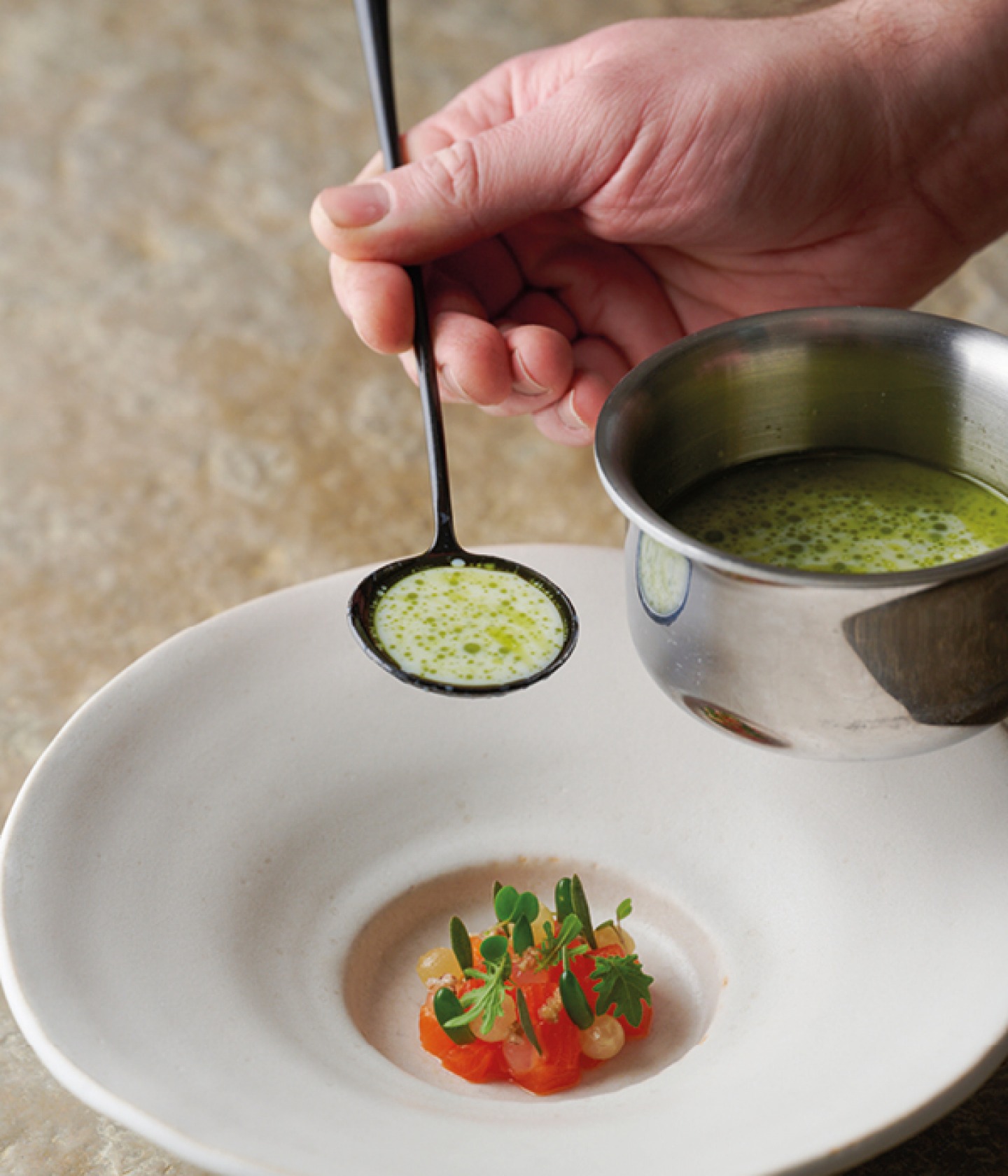 It starts with some admin and checking in with the team, then I’ll go into the walled garden – the original two-acre walled garden redesigned by Tom Stuart-Smith – and catch up with the gardening team. I’ll pick some of the ingredients needed and see what else is ready, or could be used to create a course at Forge. Above the walled garden in the orchard are greenhouses and raised beds. At the moment, there is so much growing here. It’s where my inspiration for the ‘Cherry Blossom – Grapefruit’ dessert came from, using cherry blossom from the gardens and grapefruit from the greenhouses. After that, I head back into the kitchen and start prepping for that evening’s covers. We cook for the afternoon and then eat as a team before service. I really enjoy that as it creates a family atmosphere. Then dinner service starts. As well as cooking each course, the kitchen team and I will serve certain courses to our diners. It’s a great chance to connect with our guests.