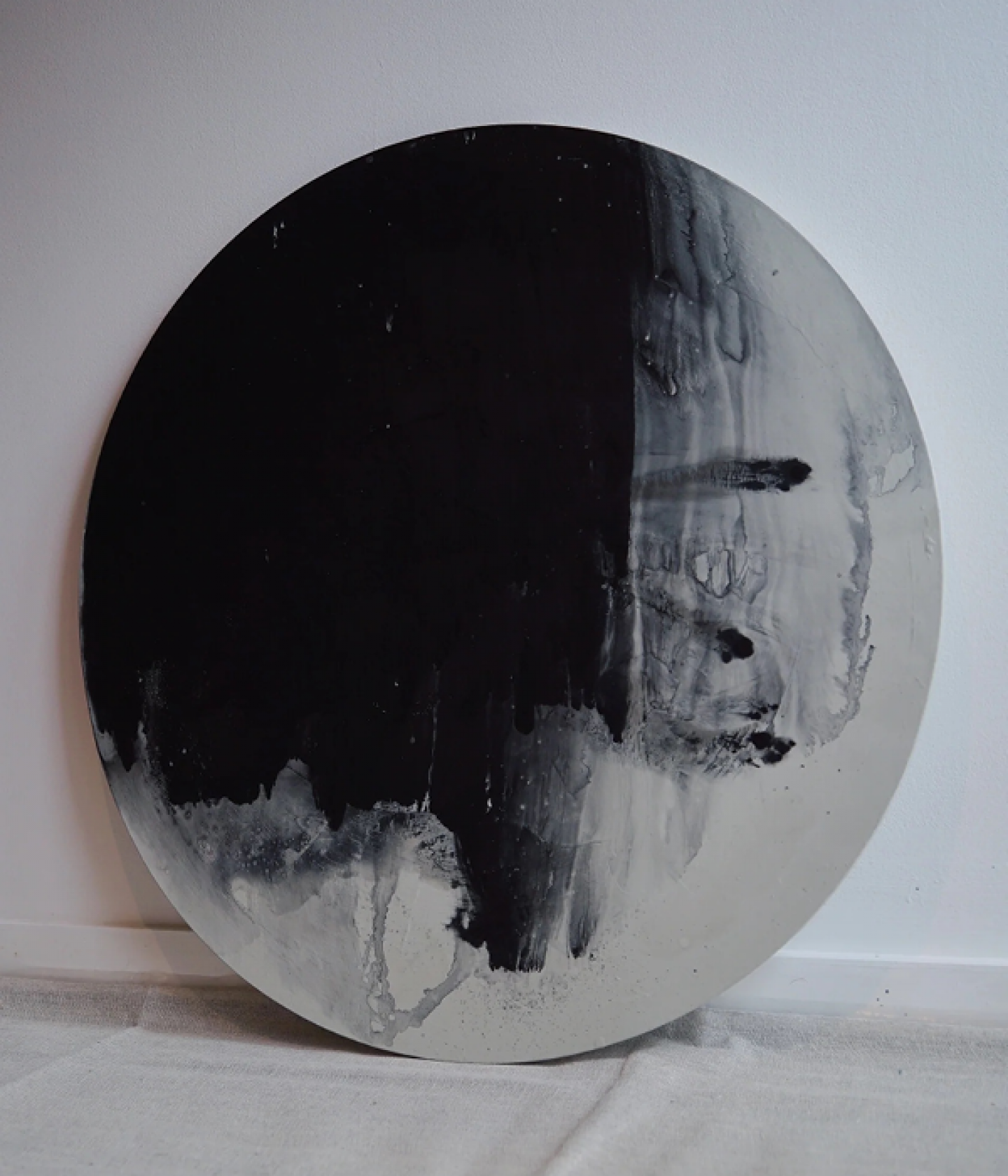 This circular painting features a dark ocean or a window into space (depending on how you interpret it).