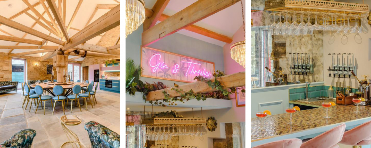 The Gin and Thresher is a stunning eight-bedroom holiday cottage to rent, with an ultra-glam pink and blue colour scheme as if designed for Barbie herself