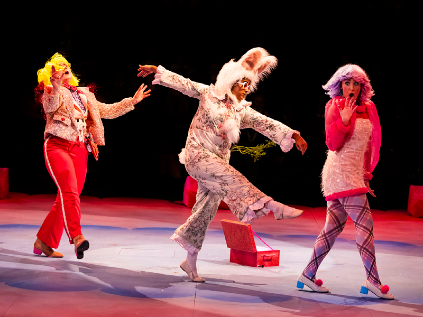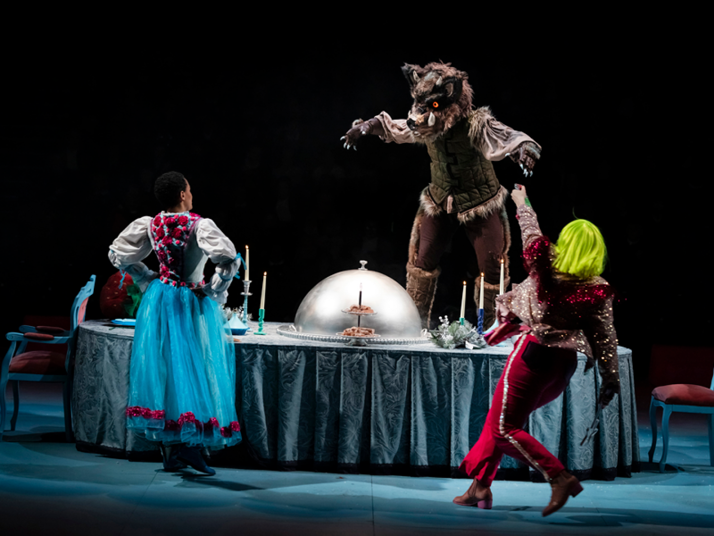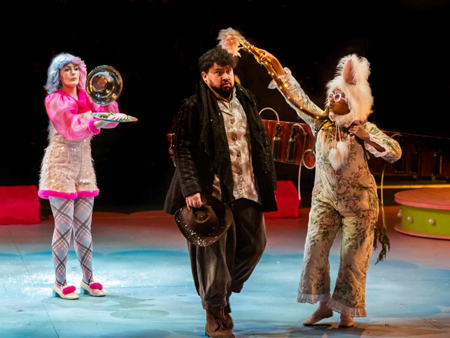 It’s in these moments that the show’s magic is most captivating – characters appear and disappear off stage and items and food appear under a cloche from a long table. There’s magic throughout, from Pink’s tricks with handkerchiefs and fire to screens showing what characters can see in the magic mirrors, and a ‘thoughtsnatcher’ machine revealing characters’ inner thoughts (and those of some of the audience members too).