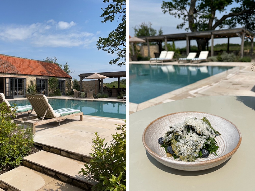 In the afternoon we once again take a dip in the pool, and as the clouds gather we head to the outdoor stone hot tub, which sits beneath a wooden frame to shelter it from the elements and has views across the pool to the open countryside beyond.