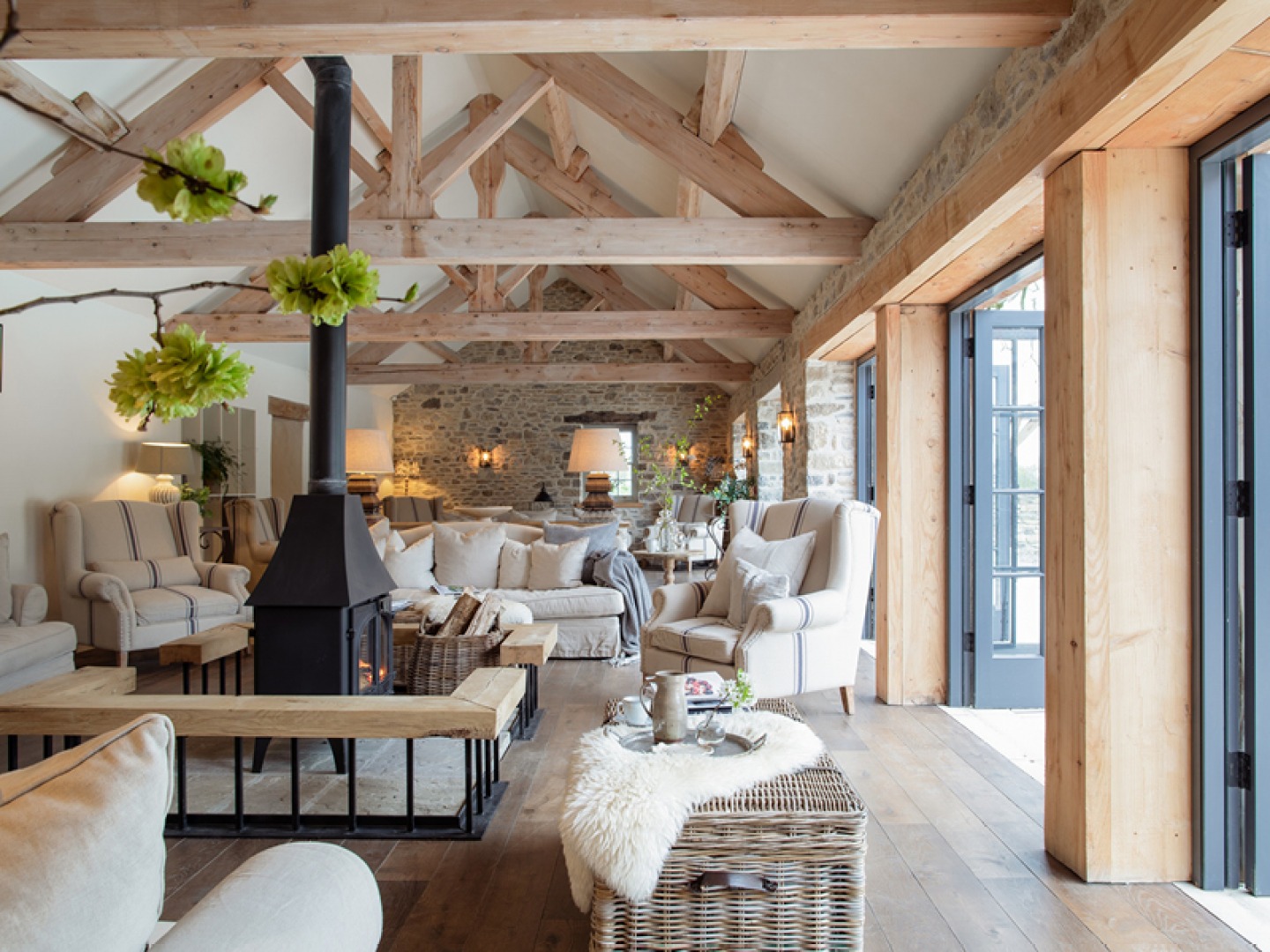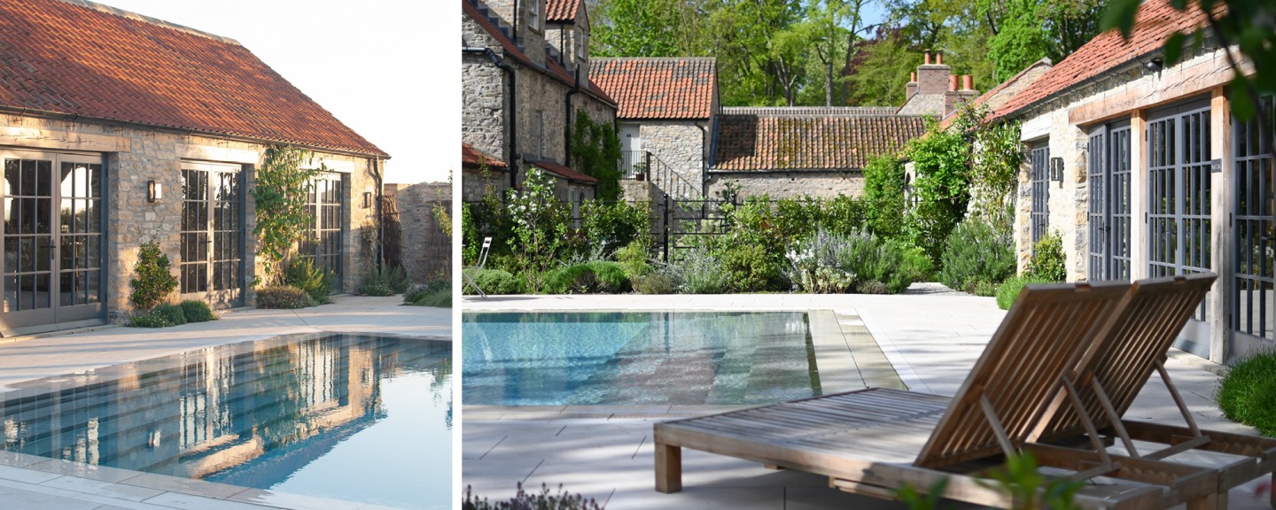At the opposite end of the pool, the pool house is filled with spaces for relaxation, squishy sofas and a central log-burning stove which will make winter days cosy and warm. Today, the doors are thrown open to let in the warmth and sunlight.