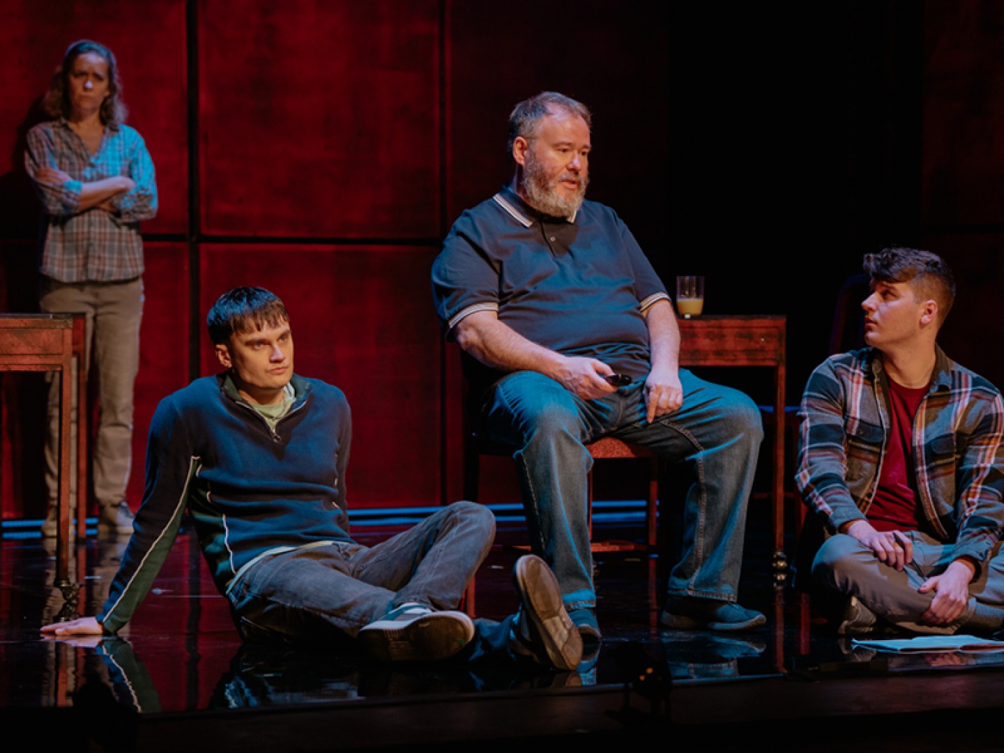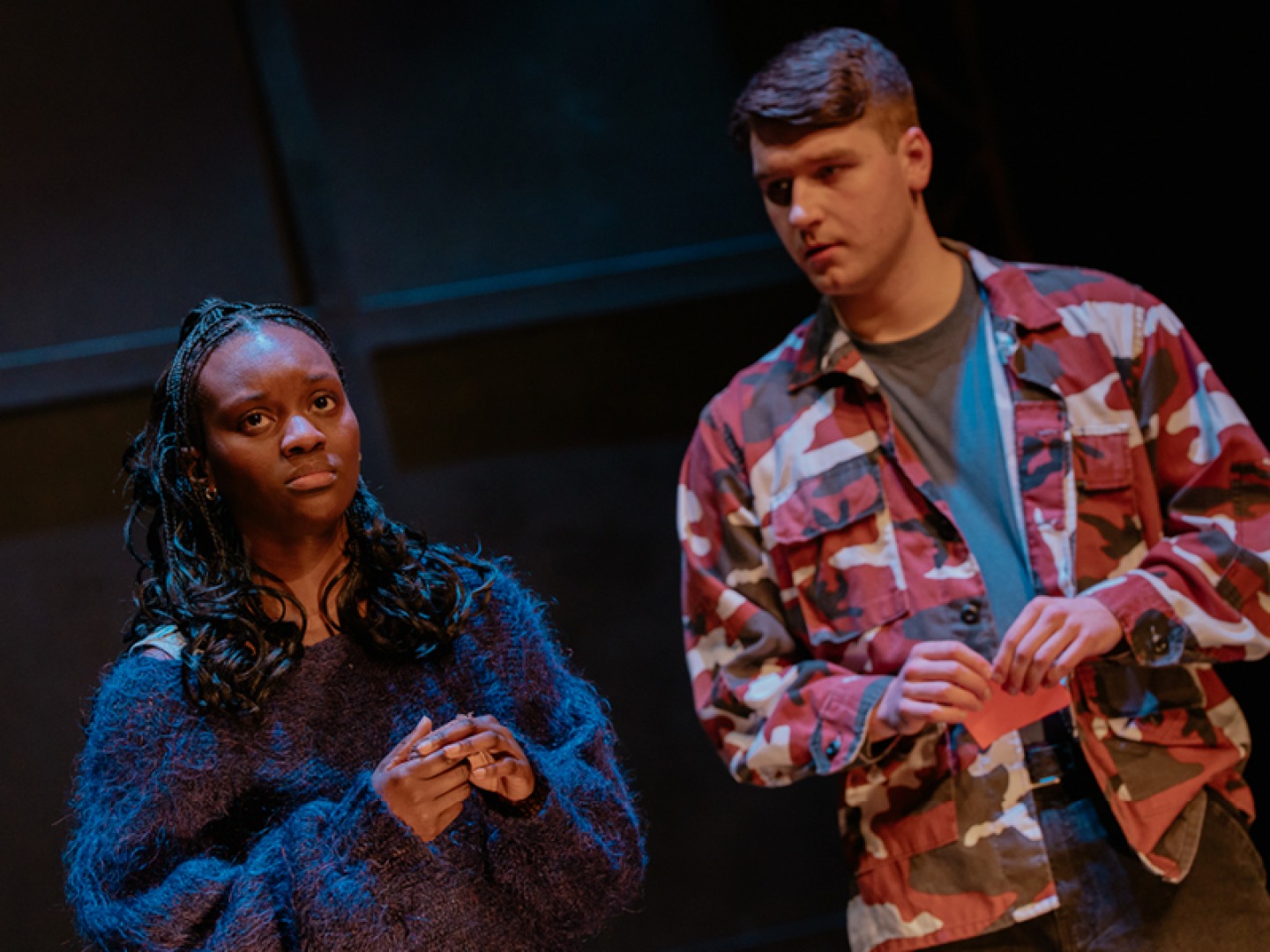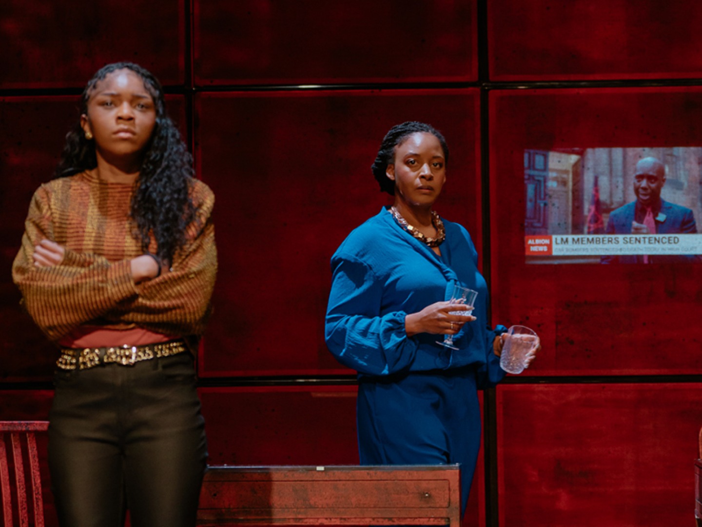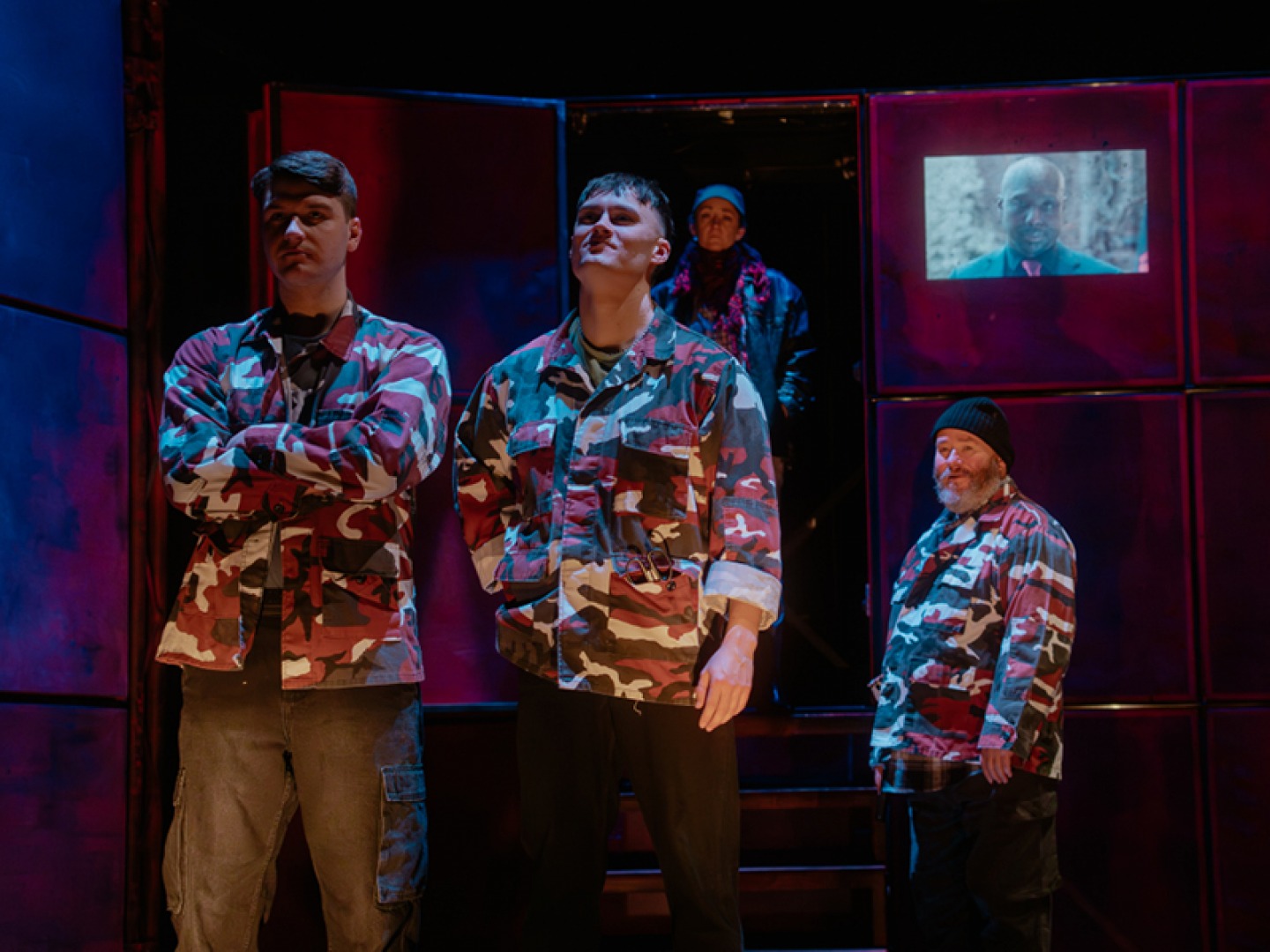 In this production, directed by Esther Richardson, a simplistic but artistically clever set acts as a canvas for various locations, from beach to café to underground bunker. As the story unfolds, the set does too. Sections of red squares open like windows and doors, the whole backdrop parts in the middle to reveal steps to a platform, and TV screens are projected onto it to add a digital element to the storytelling in the form of news reports. The lighting is clever too, particularly in scenes where both families appear on stage, and especially during the dramatic bombing scene where loud bangs and strobe lighting shock audience members.