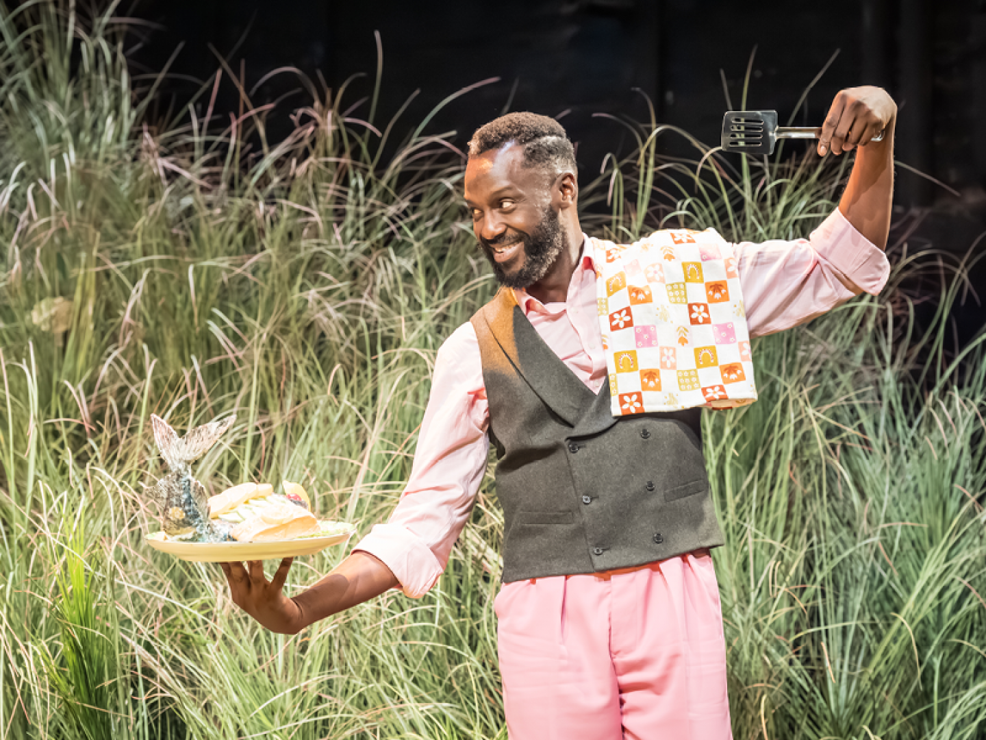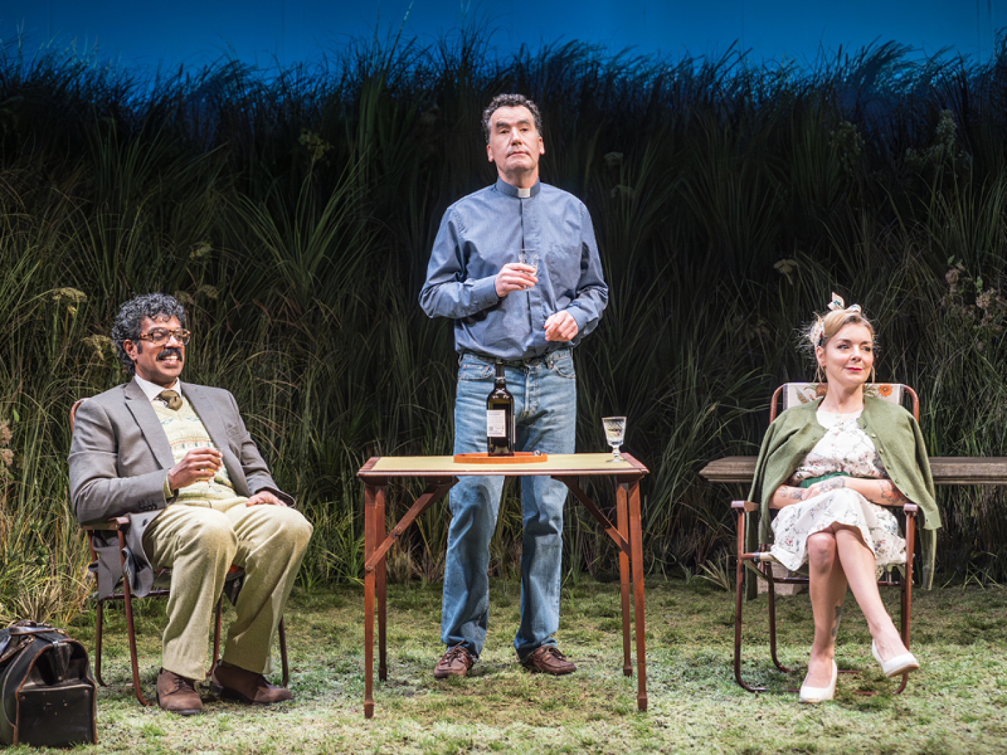 Despite a spectacular rain scene and disorientating sound in act two, the setting itself is simplistic with good reason. A largely conversational play, it doesn’t need bells and whistles. Sheridan’s endearing performance of a mentally fragile woman battling her unravelling mind and Romesh’s faultless comedic timing throughout complement the fantastic ensemble and their quirky characters. The ensemble is an impressive lineup including Tim McMullan (best known for playing Atticus Pünd in the BBC mystery dramas Magpie Murders and Moonflower Murders) as Gerald and Chris Jenks (as seen on screen in Sex Education and Robin Hood) as Tony.