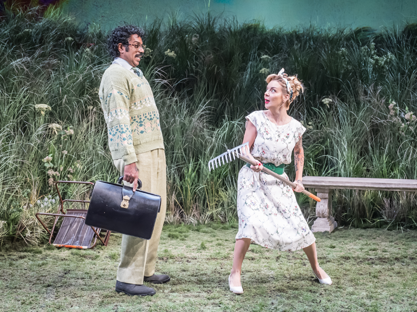 For much of act one the safety curtain hides the majority of the stage, an interesting choice which leaves an intimate space for performance as figures from Susan’s imagined life appear from behind the curtain. When the full set of a maze of foliage is revealed, we remain in Susan’s garden where she bumped her head, but the lines between reality and fantasy blur as the characters move around on stage.