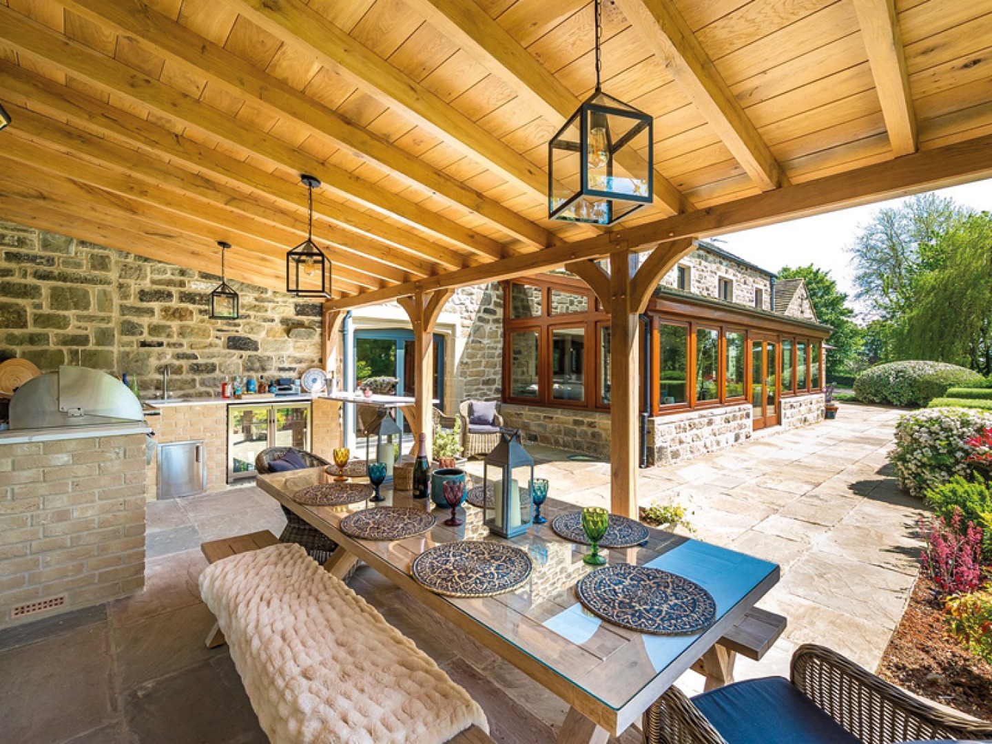 A charming stone archway leads to a living room with oak flooring, a cosy log burner, a door leading to the private garden and double doors which open out to the fantastic outdoor kitchen. Furthermore, there is a spacious sunroom with access to the garden, with solid oak doors and windows, electric underfloor heating and a feature stone wall.