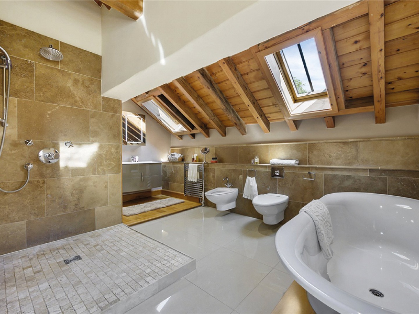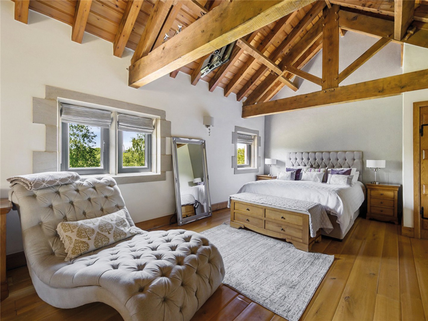 Another bespoke staircase with a wrought iron balustrade leads to the first floor landing, with attractive oak beams and access to three bedrooms and three bathrooms. The main suite has amazing views over the surrounding countryside, solid oak beams and flooring, and an ensuite bathroom with a porcelain tiled floor, a separate Villeroy & Boch shower, toilet, wash hand basin, bidet, heated towel rail and two velux windows.