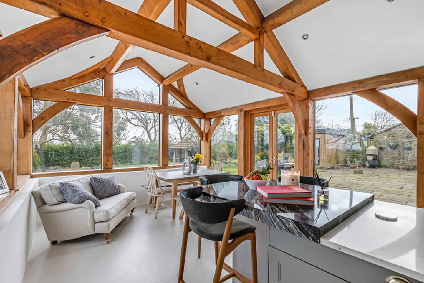 One of the most impressive features of Lane House is the kitchen and dining area, located in an oak extension of the original house. The extension boasts generous windows and an abundance of natural light, allowing uninterrupted views over the surrounding countryside. The kitchen is new, installed at the end of last year; soft grey panelling and a trendy quartz kitchen island and breakfast bar give a modern yet timeless feel. It houses a range of useful amenities, such as a warming drawer and four ring induction hob and even includes a Teppenyaki hotplate grill built into the kitchen island. Double doors lead seamlessly out into the garden, allowing for al fresco dining.