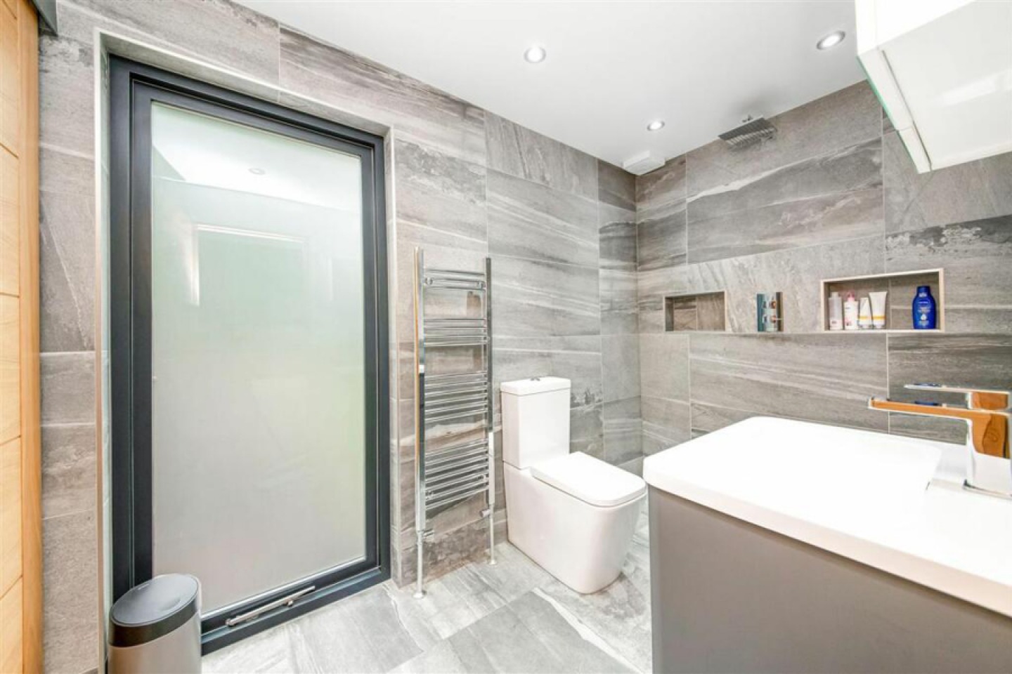 The lower level of the first floor is primarily taken up by a huge, open-plan living room. This has a wood burner in the corner, and faces on to picture windows and bi-fold doors which lead on to a large balcony overlooking the hillside. The balcony is more than big enough for al fresco entertaining in summer. Tucked into the corner of the first floor is a small but – courtesy of another picture window – bright study, a home office with panelled walls, and an ensuite bedroom.