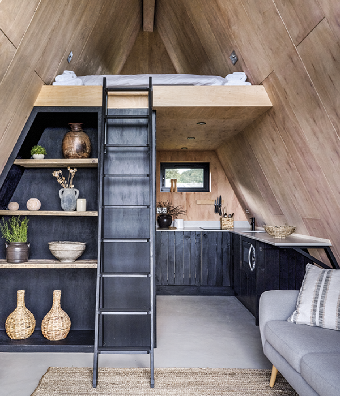 They then teamed up with the specialist company Life Space Cabins, which provided detailed technical drawings, and hired a couple of skilled joiners to bring their vision to life. The accommodation now on offer at West Cawthorne Farm includes two identical A-frame cabins, one of which is shown here. It was built from simple materials: black corrugated steel for the roof, aged Siberian larch for the external cladding and plywood panels for the interior walls. There is a kitchen and bathroom to the rear of the cabin, a living space at the front and a bedroom on the mezzanine level. The Vermonts’ considered planning and the makers’ careful craftsmanship can be seen in the construction, right down to the smallest details. The finished structure stands out among the traditional stone farm buildings like a bold black shard rising up out of the landscape.