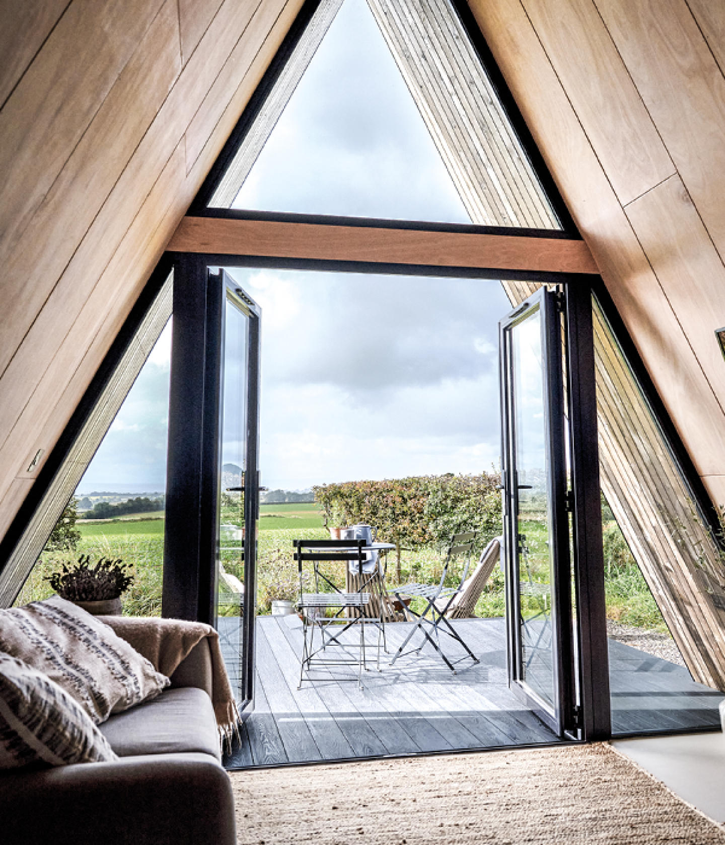 The A-frame design is all about outlining the view outside, so it is a perfect fit for the countryside setting. Natural light filters in through the huge glass windows, which offer expansive vistas over the surrounding fields. As part of their commitment to rewilding and conservation, Sophie and Rich have planted hundreds of trees and created a wildflower meadow, so there is now an abundant natural habitat for animals, insects and birds.