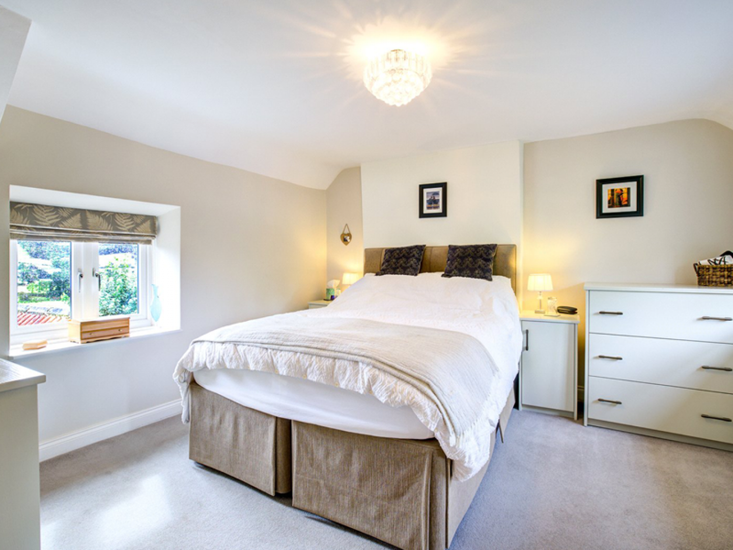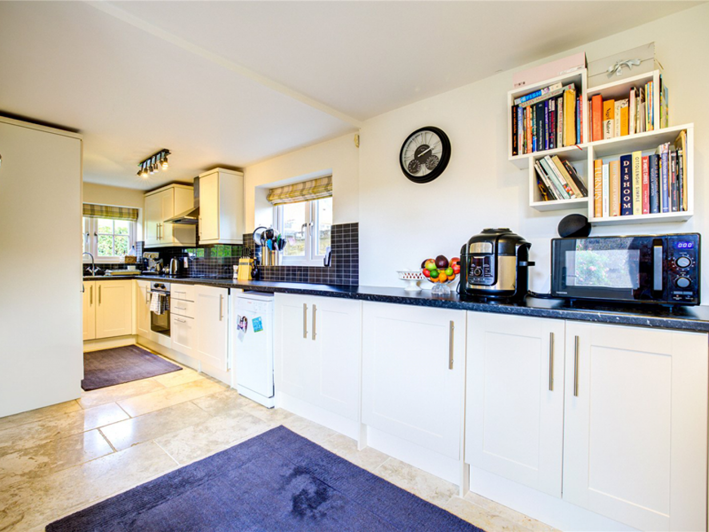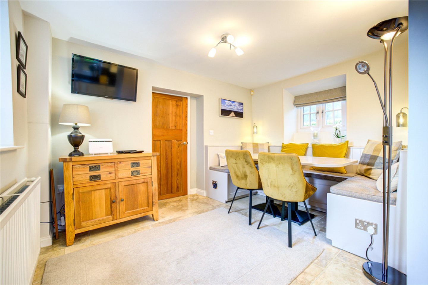 At the heart of the cottage lies the open-plan dining kitchen, a space designed for both daily life and entertaining. The dining area, with limestone flooring and bespoke bench seating, leads seamlessly to a beautifully-appointed kitchen with cream cabinetry, contrasting worktops, and integrated appliances. Step outside to the rear sun terrace and