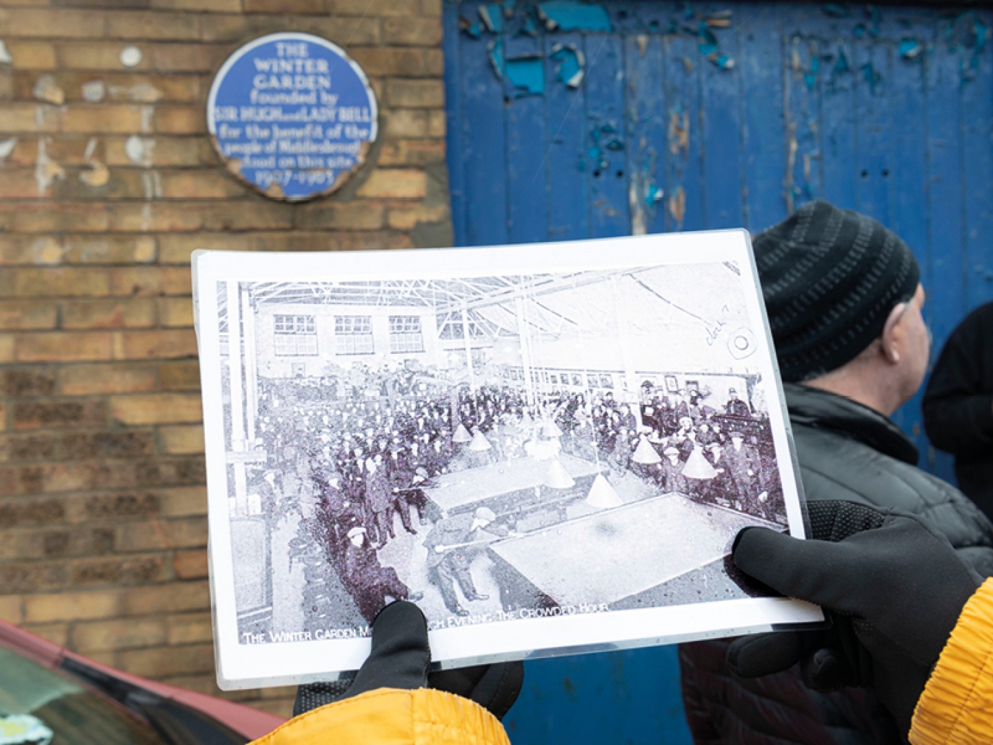 Middlesbrough Winter Garden Blue Plaque: a person standing in front of The Winter Garden, looking at a historic photograph of the building.