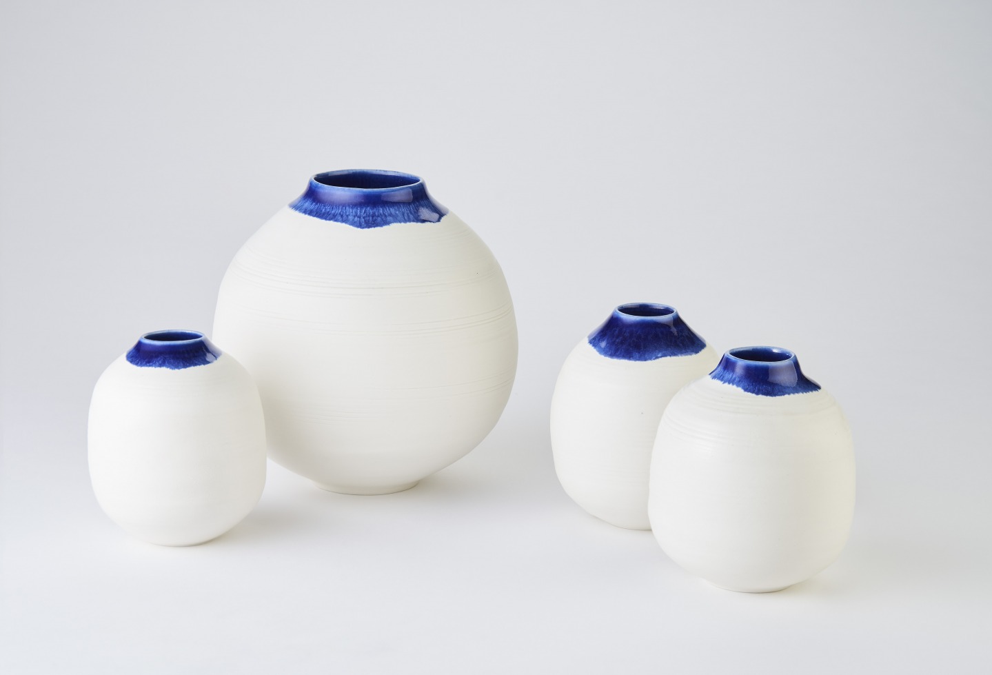My Icelandic collection, the culmination of a research trip to Iceland, expresses the ‘otherworldliness’ of the landscapes there. The white porcelain and blue moon jars reflect the beautiful volcanic and mountainous landscapes surrounding Reykjavik, glazed with cobalt blue inside and cobalt and tin glazes dipped on the rim. The black onyx porcelain series is reflective of the black basalt beaches of Vik in Southern Iceland.