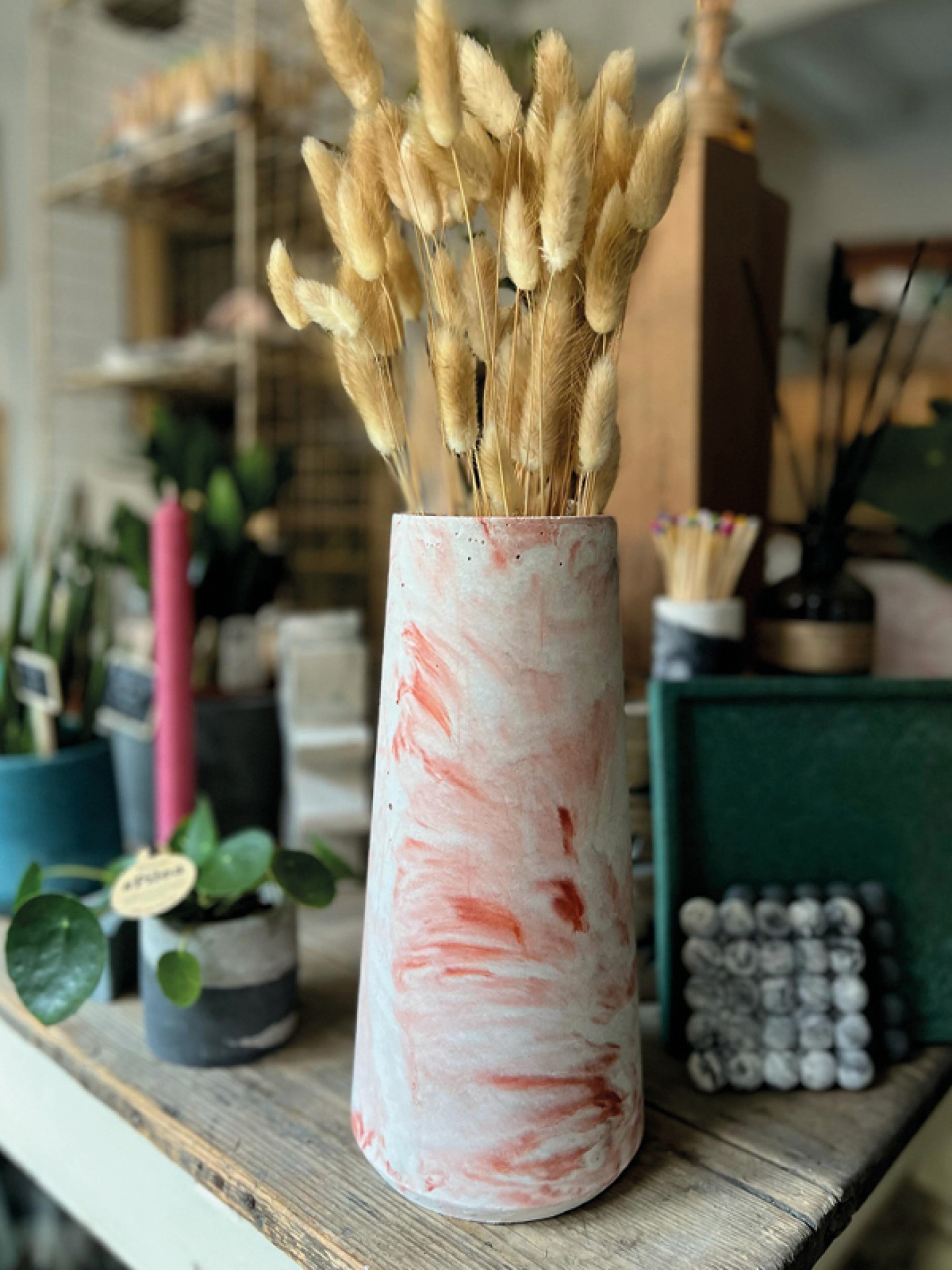 This white and rose marble concrete vase is minimalist and modern – add the bunny tails to complete the look. £22 (vase only) Concrete & Cacti