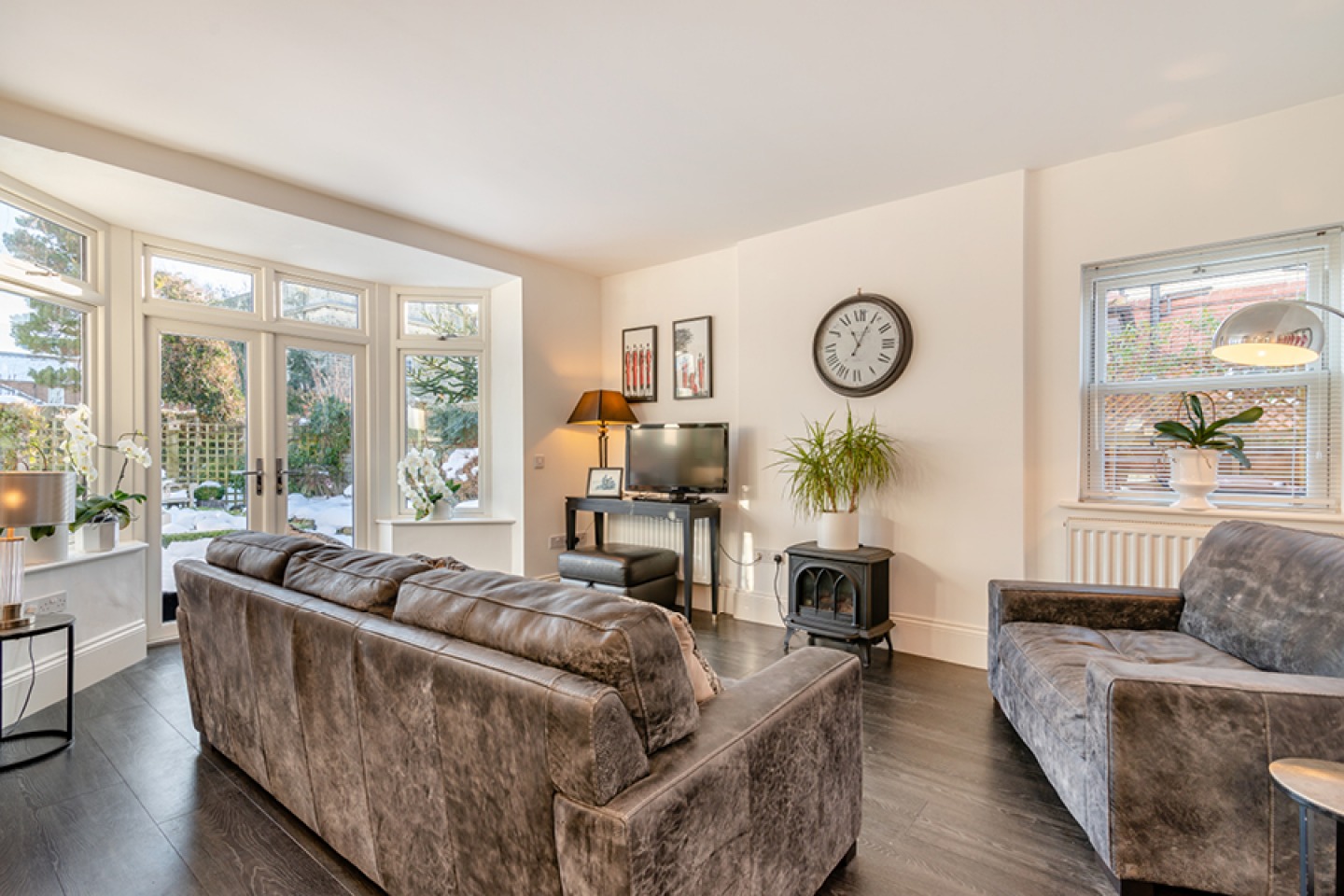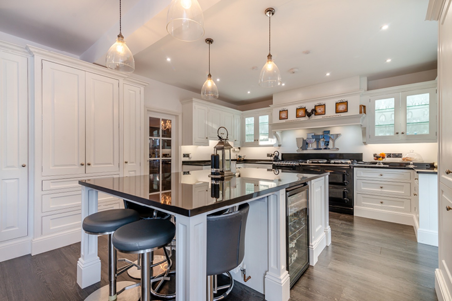 The property opens with a welcoming entrance hall, with a practical utility and cloakroom joined on. The dining room is spacious, and at the front of this floor is a magnificent drawing room with beautiful period features such as a cast iron fireplace and bay window. The kitchen has white integrated units, an AGA and a large central island with breakfast bar and wine chiller, great for entertaining or simply enjoying the room in style. The family room opens onto the patio terrace, allowing in lots of natural light, and off the kitchen is a conservatory with garden access.