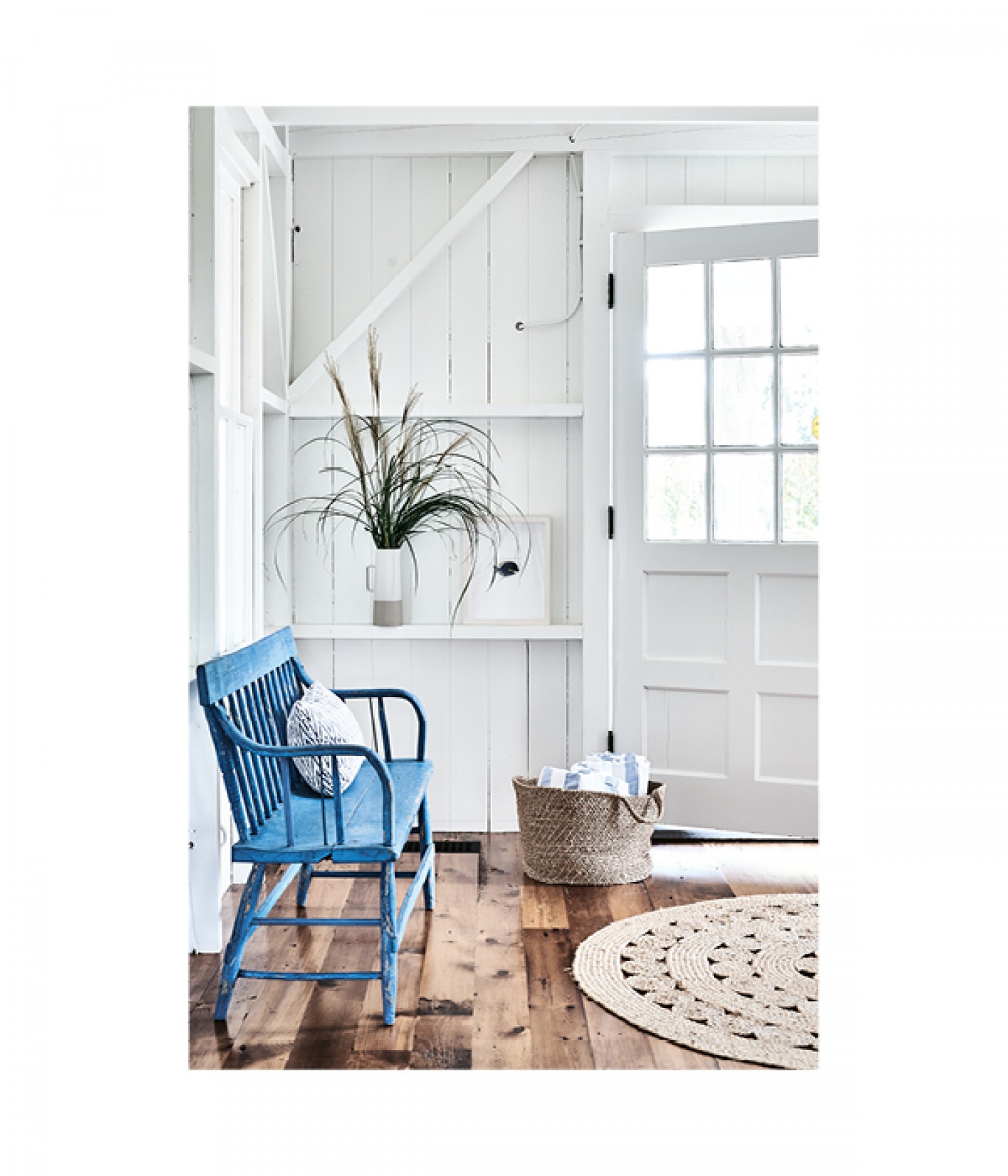 It was the hallway, built when the two original cottages were joined together, that inspired the purchase of the cottage. The owners loved the exposed wooden framing and used it as a model for the entire renovation. The blue-painted bench was the first piece of furniture they acquired.