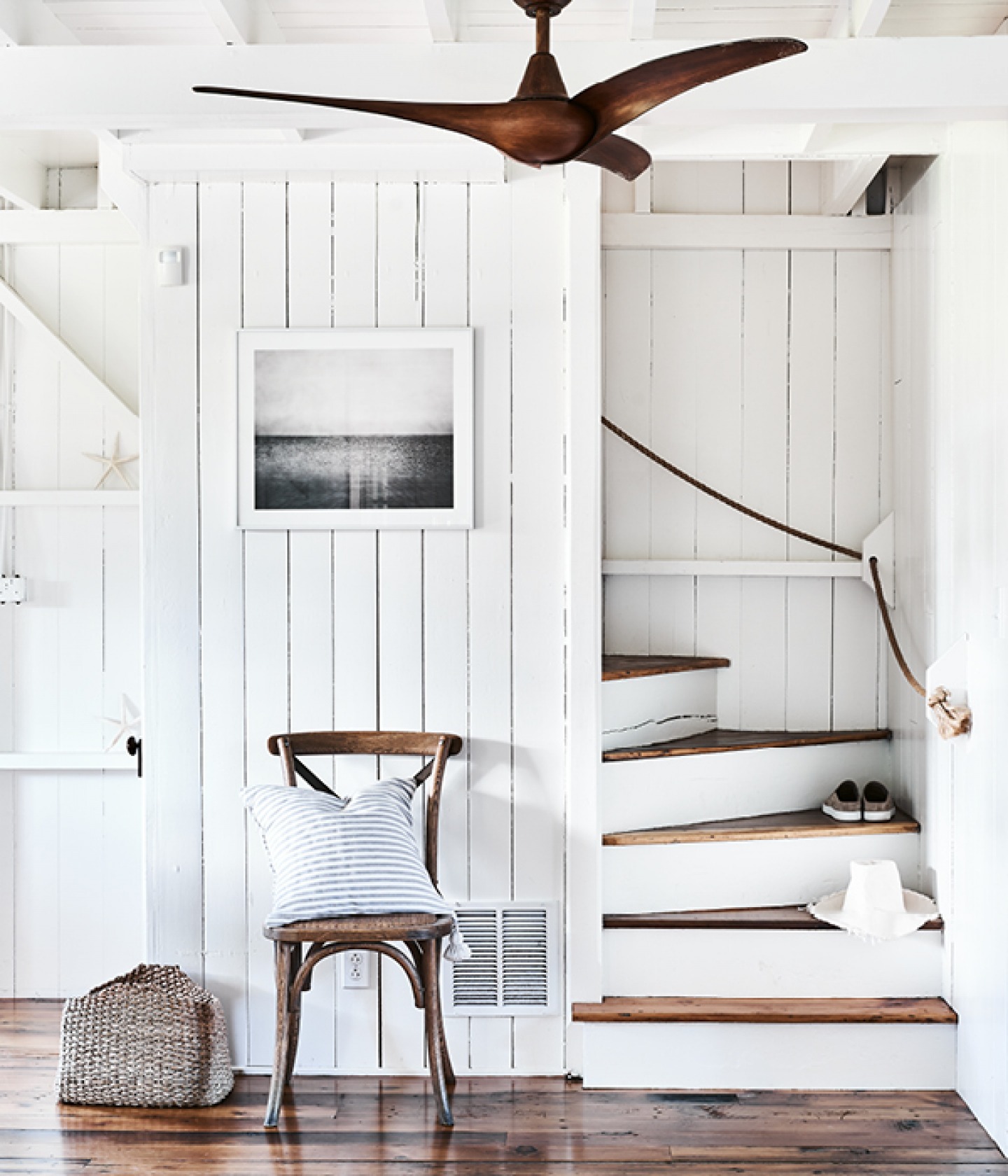 Leading up from the dining room is a boxed-in staircase where a sturdy old mooring rope is used instead of a handrail.
